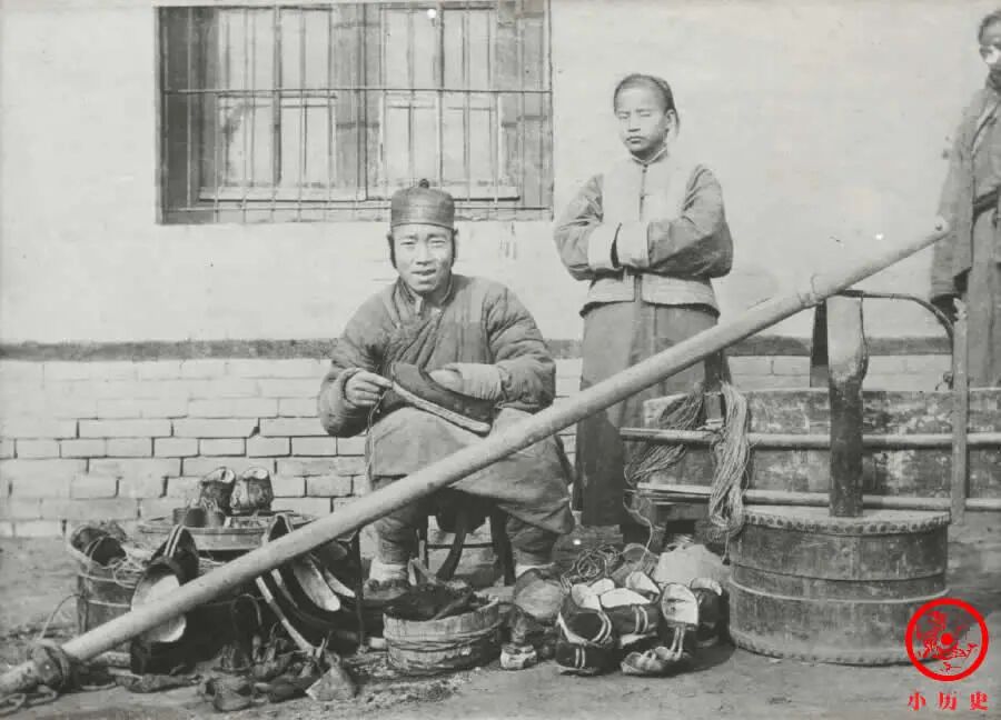 这位鞋匠挑着扁担走街串巷,不仅可以修鞋,也可以定做新鞋。当时处于冬季,生意好做,等到夏天,很多人不穿鞋,顾客就没那么多了。