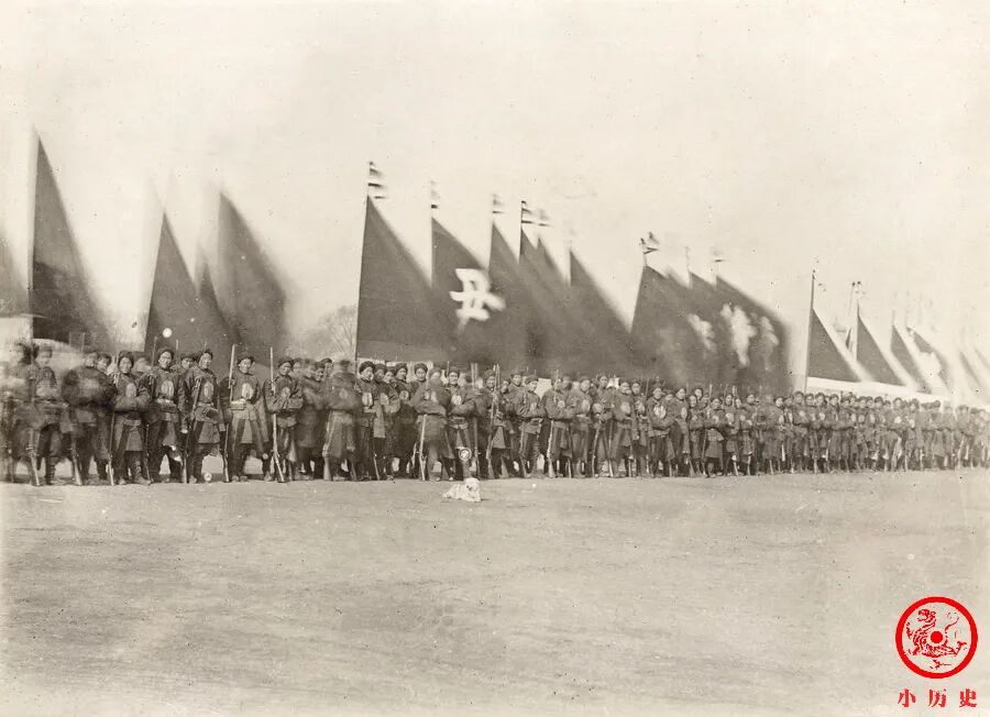 校阅场上旗帜招展,但那些士兵并没有精神抖擞。他们虽然排成了队列,但是参差杂乱,军容不整;可能由于时值隆冬,天气寒冷,他们都把双手插入了袖口取暖,军姿不严肃。画面中有一只小狗趴在地上,难道是军犬?