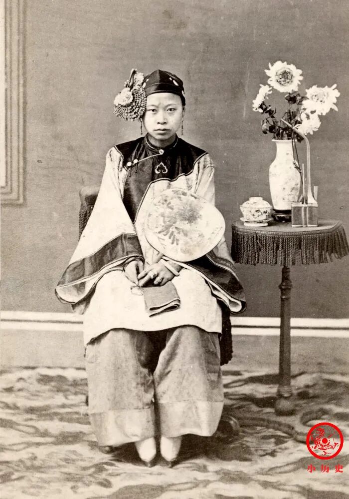 这名女子坐在一个精心设计的摄影棚里拍照,扇子、手绢、花瓶、烟袋、茶碗都是当时照相馆的标配。她年轻、俊俏,头饰、衣装堪称华美,可以认定她来自大户人家,普通人家也出不起拍照的费用。