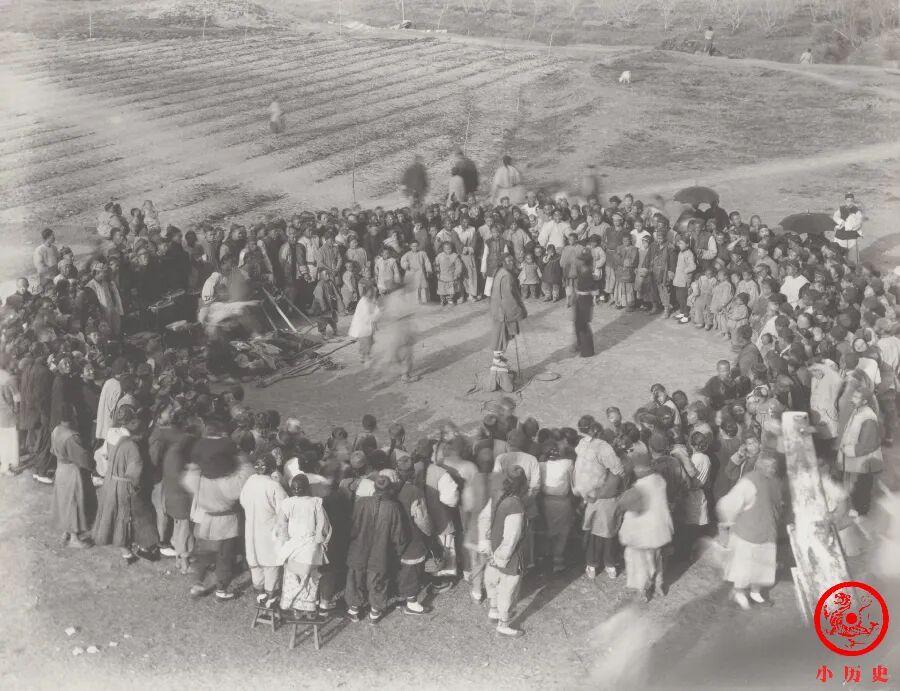 一个孩子双膝跪地、后仰躺下,一个成年人踩在他的肚子上,展现其身体的力量和柔韧性。村民们自觉地以他们为中心围成一个圆圈,观看其表演。那个年代乡间的休闲娱乐方式不多,杂耍、唱戏都能吸引人们的热切关注。