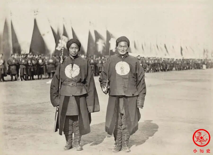 这张照片可以让我们看清两位士兵的服饰、装备,一人拿步枪、一人持利剑,站姿倒是很挺拔。从乾隆后期开始,武备废弛,清朝没有训练出任何一支真正能打仗的军队,哪怕是像湘淮军那样平定了太平天国之乱的“劲旅”,在抵御外辱时依然不堪一击。