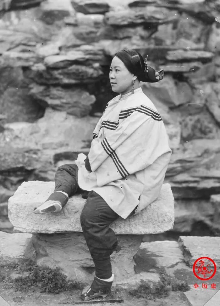 这名女子裹“三寸金莲”,穿宽袍大袖的丝绸服装,打扮精致,打造出了典型的晚清贵族女子形象。
