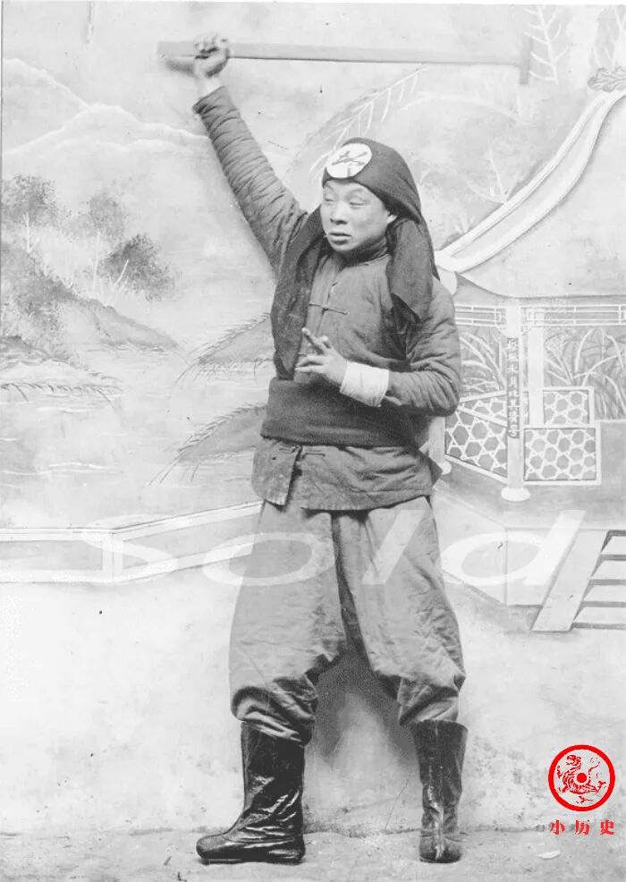 此人一手持武器(锤子?),一手做出奇怪的动作,头巾上写着“坎”字,可能是清朝“坎卦教”的成员。1899年,北方众多像坎卦教这样的民间教门,如义和拳、八卦教、大刀会、红拳等等,汇聚为义和团。他们来自社会底层,习拳练武,兼习法术,举行各种荒诞的仪式,宣扬刀枪不入的超自然本领。庚子年被慈禧太后利用,最后也被她强力镇压。
