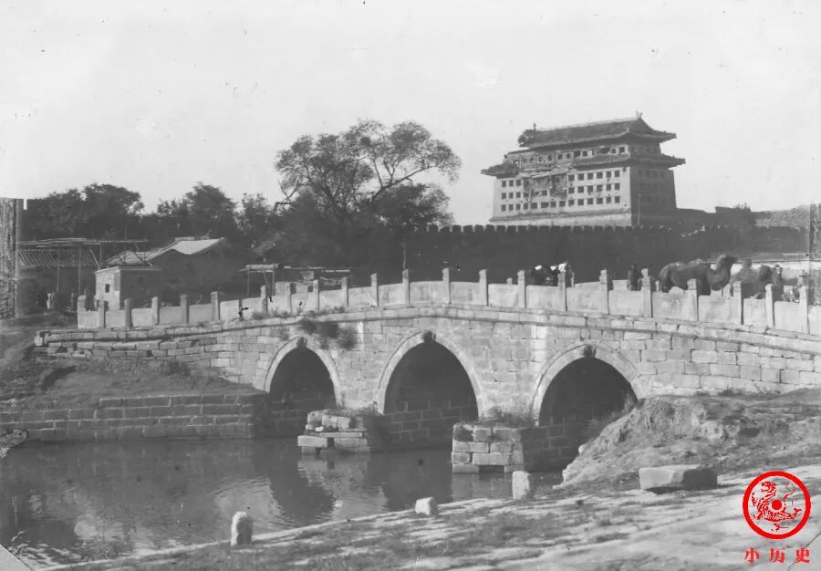 近处的三孔桥梁为大通桥,远处高大的建筑为内城东南角楼。此处角楼巍峨壮观,是城防和城楼相结合的典范建筑。1900年八国联军侵占北京时,她遭遇了炮火的轰击,部分坍塌,战后修复。幸运的是,东南角楼至今仍存,已被列入全国重点文物保护单位。