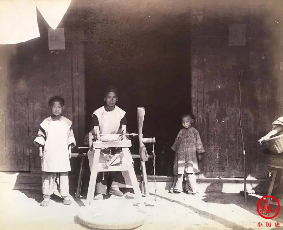 母亲正在操作简易机械,生产某种手工产品。你能看出她在做什么吗?