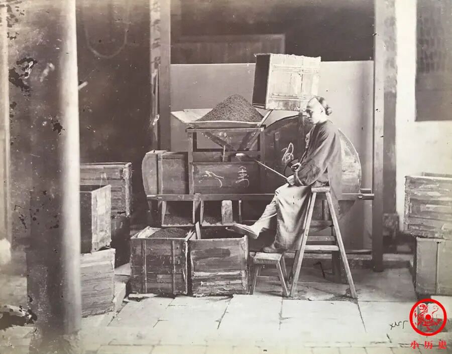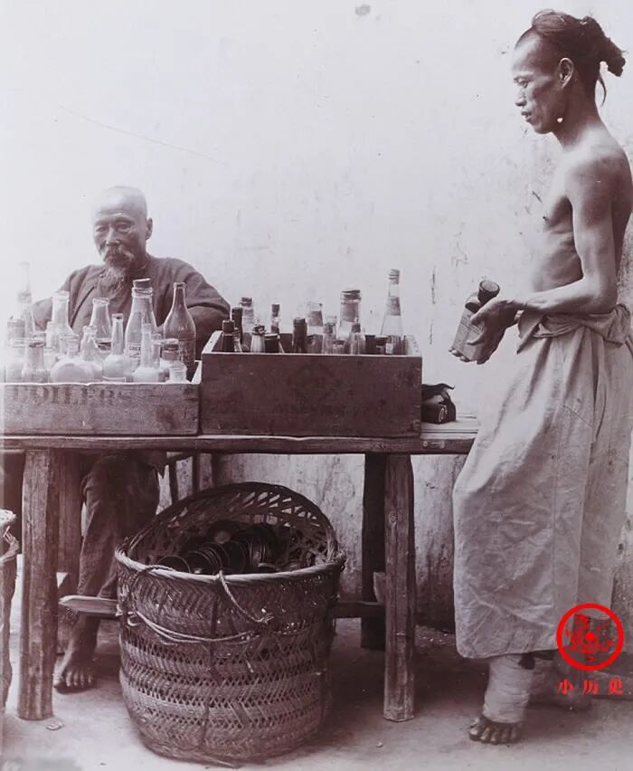 照片右侧的男子包扎着一只脚,到此选购跌打损伤药酒。在医疗不发达的年代,一些人行走江湖卖药,号称有祖传秘方,配制的药酒、药丸效果灵验,甚至能断腿接骨。说实话,这些药真真假假,很难实现真正的治疗目的。