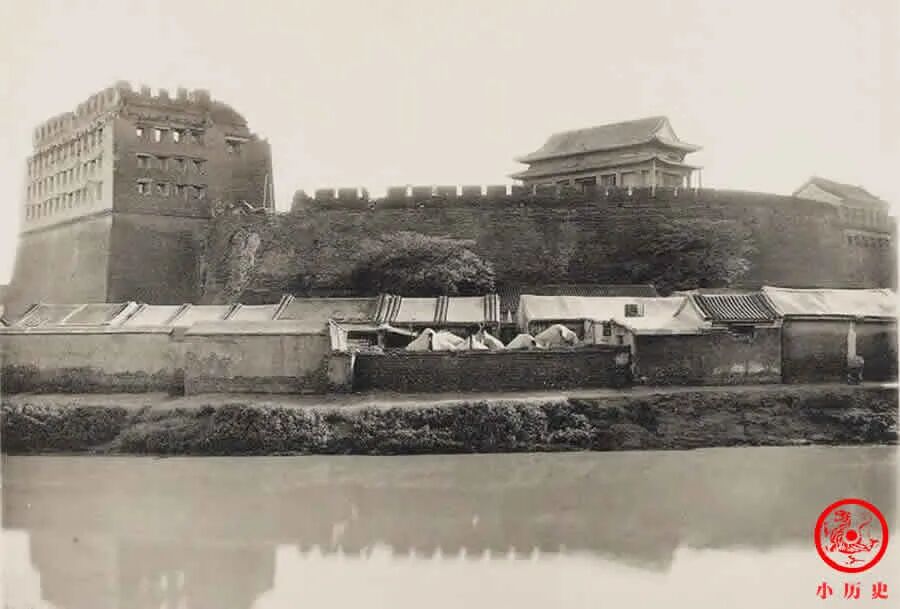 拍照时这座瓮城已经不完整,箭楼倾颓。1900年8月14日,八国联军炮击朝阳门,箭楼屋顶被炸毁,仅存下檐炮窗三层、上檐炮窗一层。联军撤退后,箭楼于1903年重建。