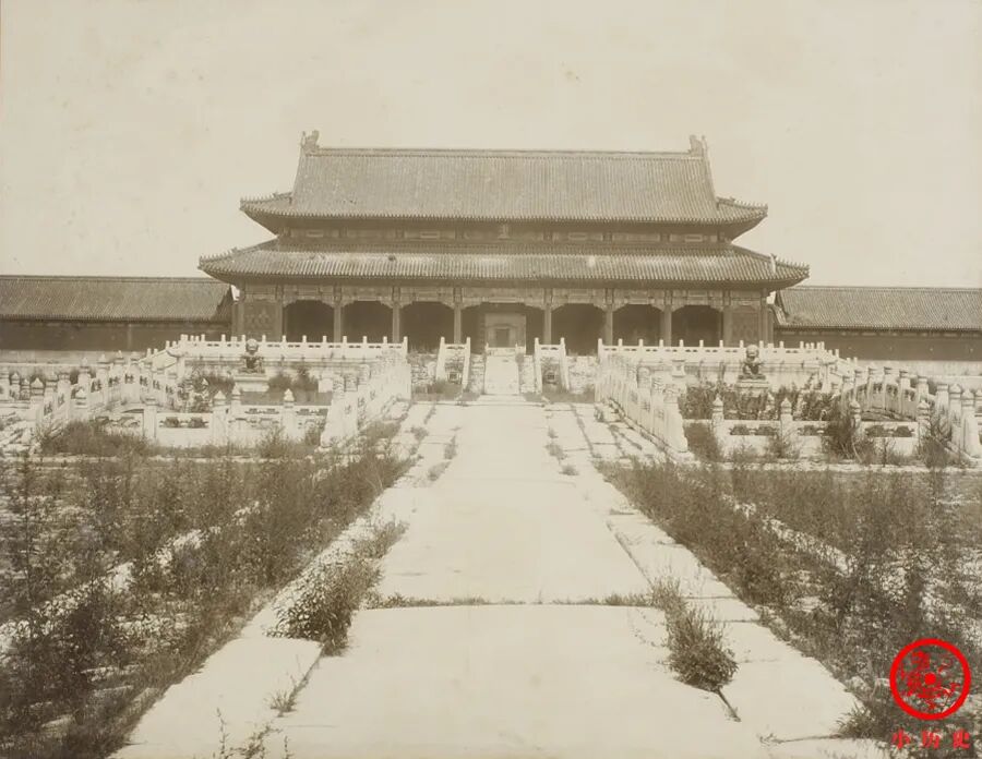 这张照片拍摄于1901年,当时金碧辉煌的紫禁城一片萧条的景象,到处长满了没膝的荒草,没有人打理。由于八国联军侵略北京,慈禧太后和光绪皇帝逃往西安,紫禁城经历了建成以来最为屈辱的时刻。