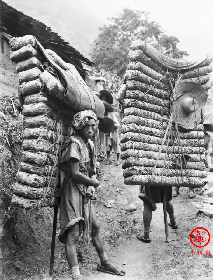 这两人挑着扁担卖草鞋,右边的汉子还卖用来做女鞋的竹纤维纸张。此地海拔大约1768米。