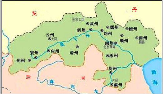 燕云十六州指的是唐朝在河北及山西北部设立的十六个州,其中幽州和云州是最核心的两个州,遂有此名。结合刚才做的地理分析,你会发现时名桑干水的永定河就是串连这十六州的轴心。只不过北京所对应的幽州位于永定河的下游;山西大同所对应的云州位于上游的桑干河部分。