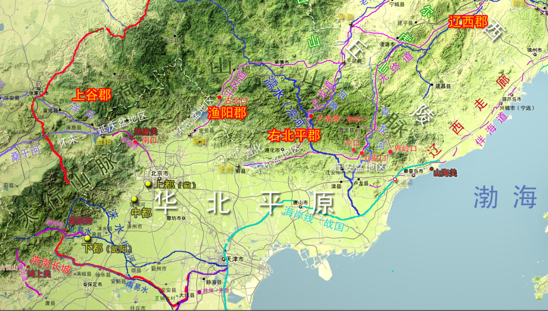 虽然山脉能够成为天然的保护,但路是人走出来的。为了打通与这三大地理单元的联系,先民们至少在这两大山脉中打通了11条通道。这其中就包括同样位于燕山与太行山之间的“军都陉”,以及燕山与渤海之间的“伴海道”。伴海道走的是燕山东麓的沿海平原走廊;军都陉的走向则与永定河谷一致。作为华北平原位置最为靠北的两条出境通道,又处于地理单元相接之处,你可以想象它们必定会在所有道路中,成为应对北方威胁的两大方向。