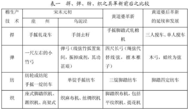 由于种植棉花的历史够长,黎族已经发明了轧花机来解决棉籽剔除的问题。黄道婆从海南带回来的手摇轧花机技术,并将之改良为在当时被称之为“木棉搅车”手摇脚踏式轧棉机,借助这一先进的轧花技术,皮棉生产效率提升了数倍(工利数倍)。同时黄道婆还改进的弹棉、纺纱、织布技术,让这些环节的效率也都提升了数倍。