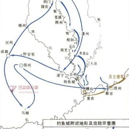 位于合川的钓鱼城是所有的山城堡垒中最为知名的一个。作为重庆城在嘉陵江方向的前沿,守住了这座卫城就可以将蒙古大军阻挡在川东岭谷之外。至于长江航道则由重庆城自己负责,只要重庆城不失,即便蒙古水军顺江而下绕过这座江城,也必然会因为两面受敌之故而无法出川。