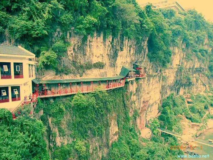 于是为了穿越这类河谷,古人发明了“栈道”这种特殊的道路。具体的做法是在崖壁上开凿一个个孔洞,并钉入木桩,然后再在上面铺上木板形成悬在空中的道路。比如直穿秦岭南下蜀地的五条古道,除了陈仓道以外另外四条均借助栈道方能通行(褒斜道、傥骆道、子午道、峪谷道)。