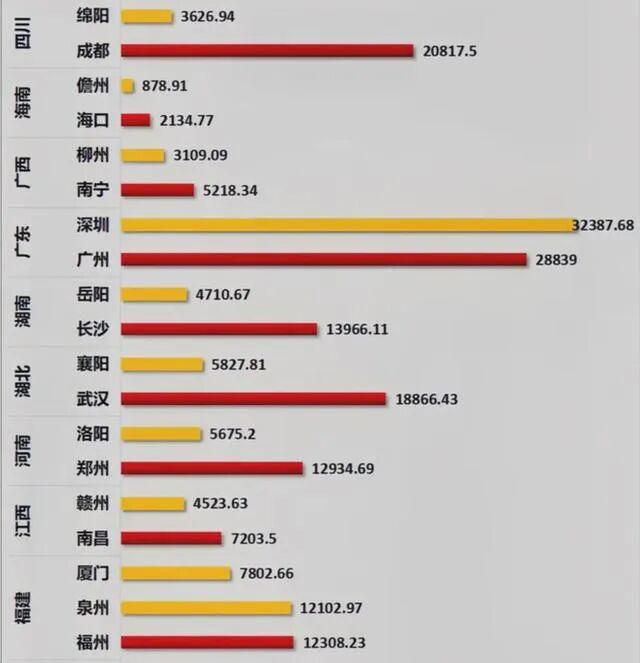 没有一座城市像成都那样,在省内的首位度如此之高。以2022年的数据来说,成都作为四川排名第一的城市,GDP为20817.5亿人民币,占整个四川省GDP的36.8%;排名第二的绵阳则为3626.94亿人民币,仅为成都的17. 4%。这个幅度在中国27个省及自治区中无出其右,几乎可以说是“一座成都城,半个四川省”了。