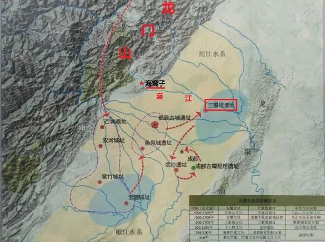 没有形成冲积平原之前,成都平原原本是一个蓄满了水的凹陷盆地,南北长约200公里的龙泉山则是一个天然大坝。待到岷江水与沱江水从青藏高原带下来的泥沙,把湖底淤高变成平原后,古蜀文化的萌芽便开始在此萌发。