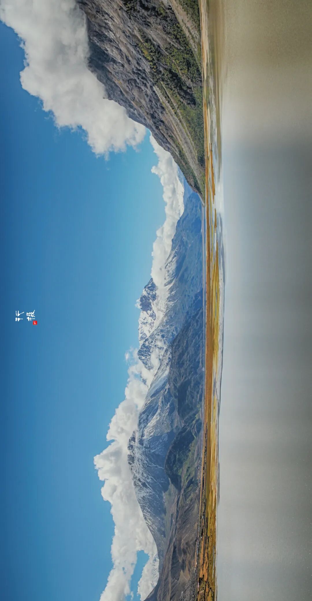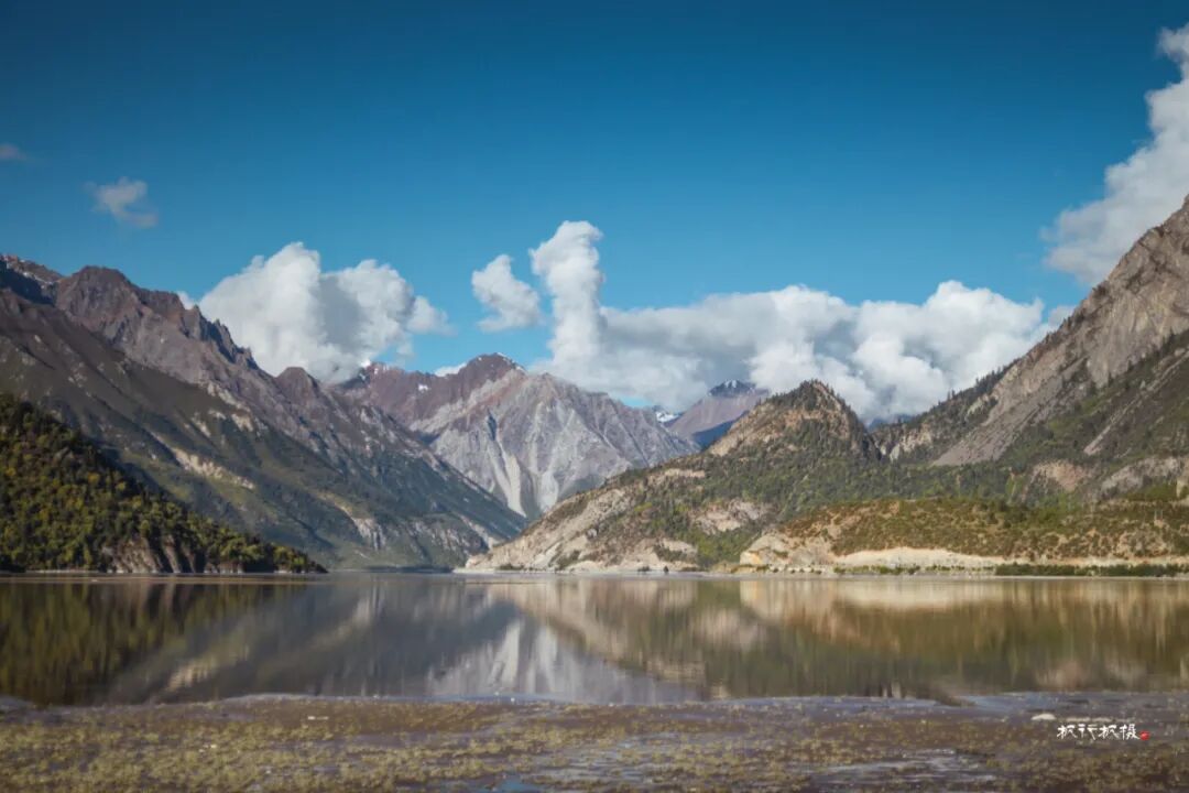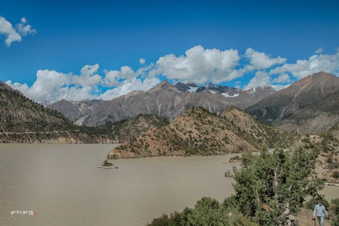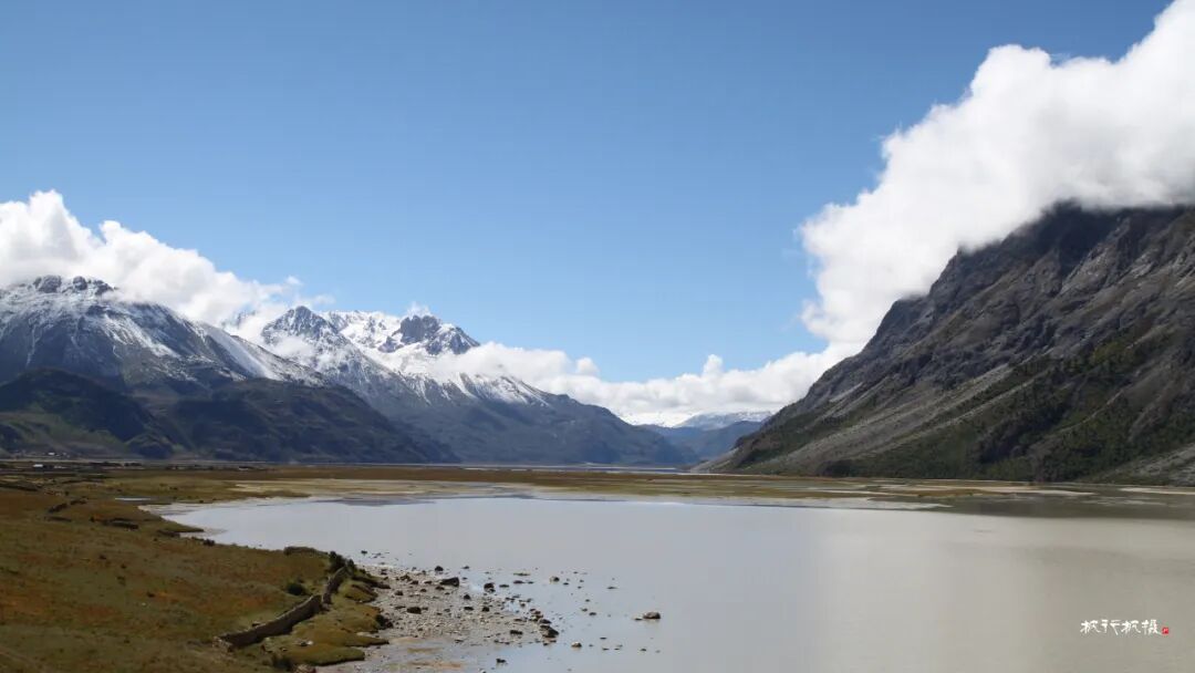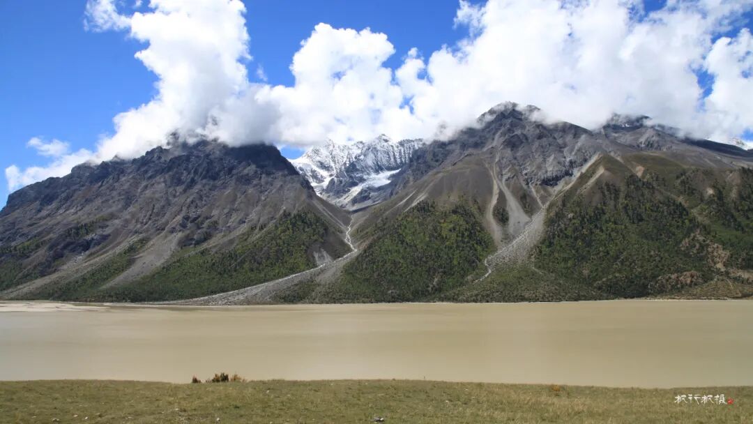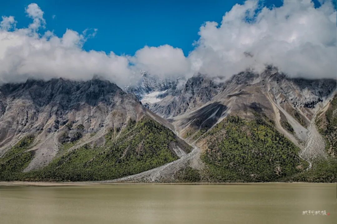 秋天的然乌湖湖水还比较浑浊,湖的四周环绕着高山,山顶覆盖着皑皑白雪,而山腰却被金色的树木环绕,层次分明。雪山湖水相依,白云村庄掩映,构成一幅醉美画卷。