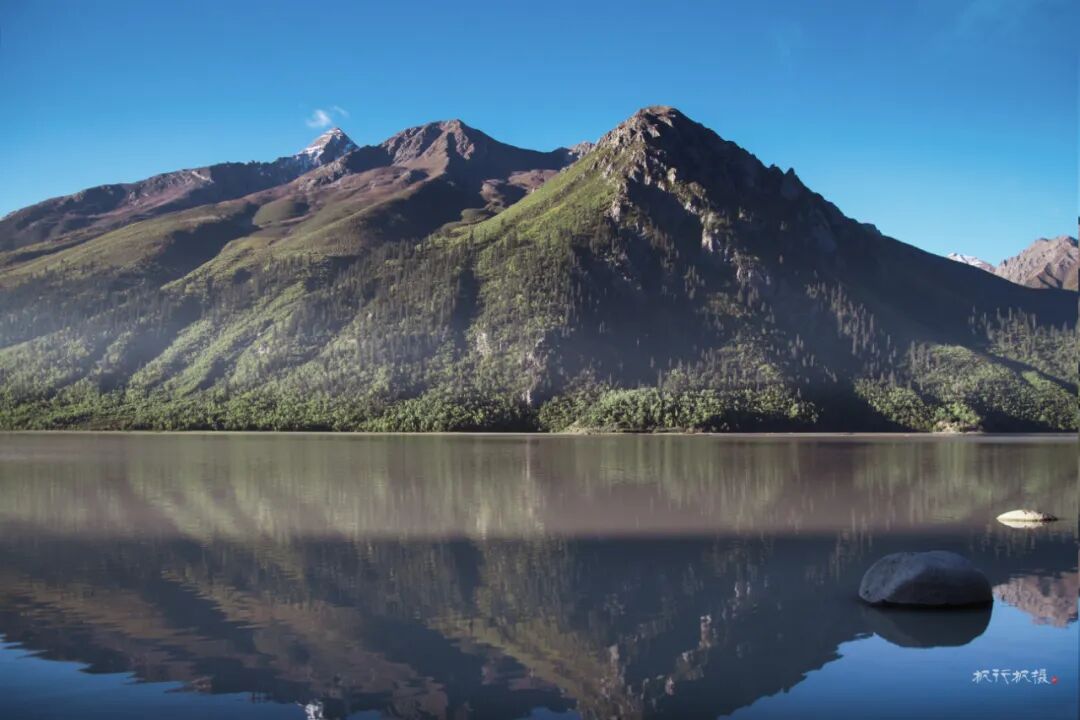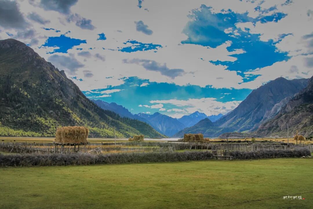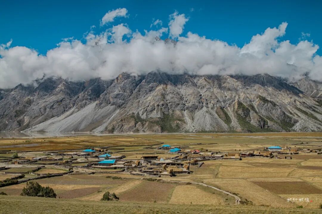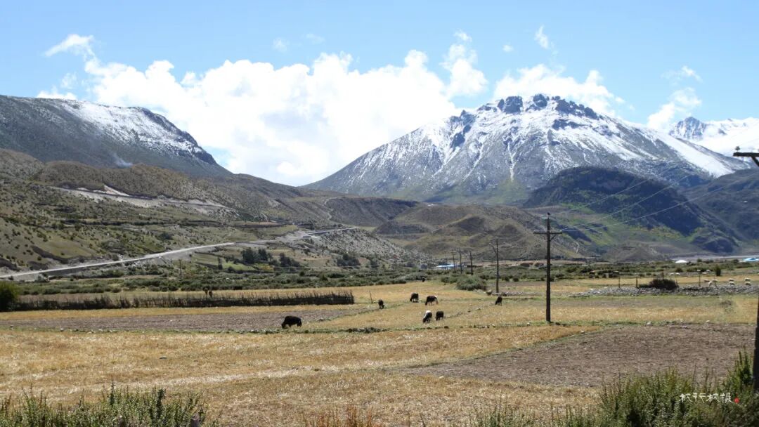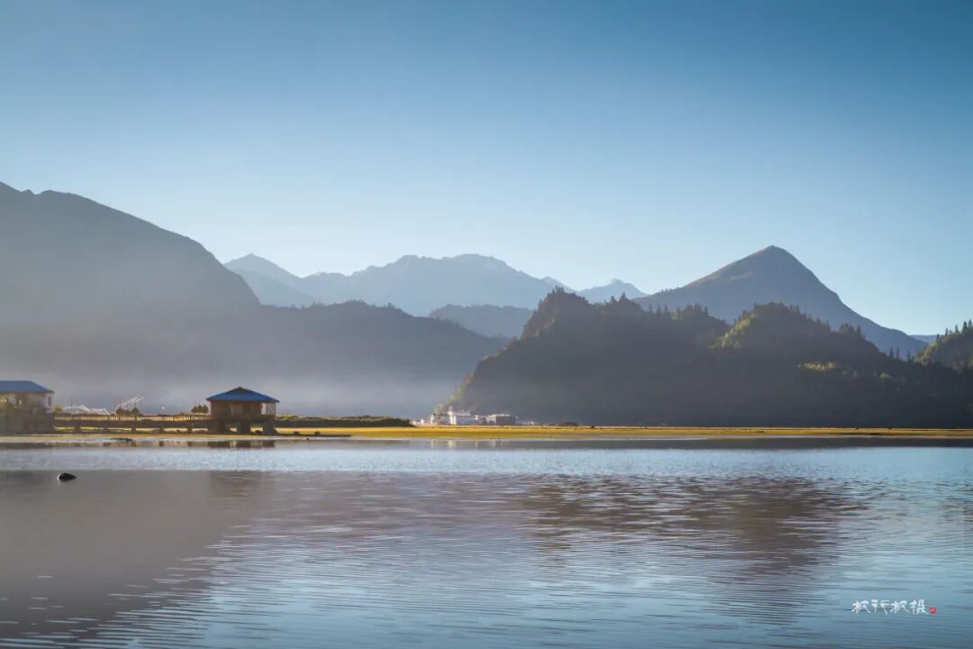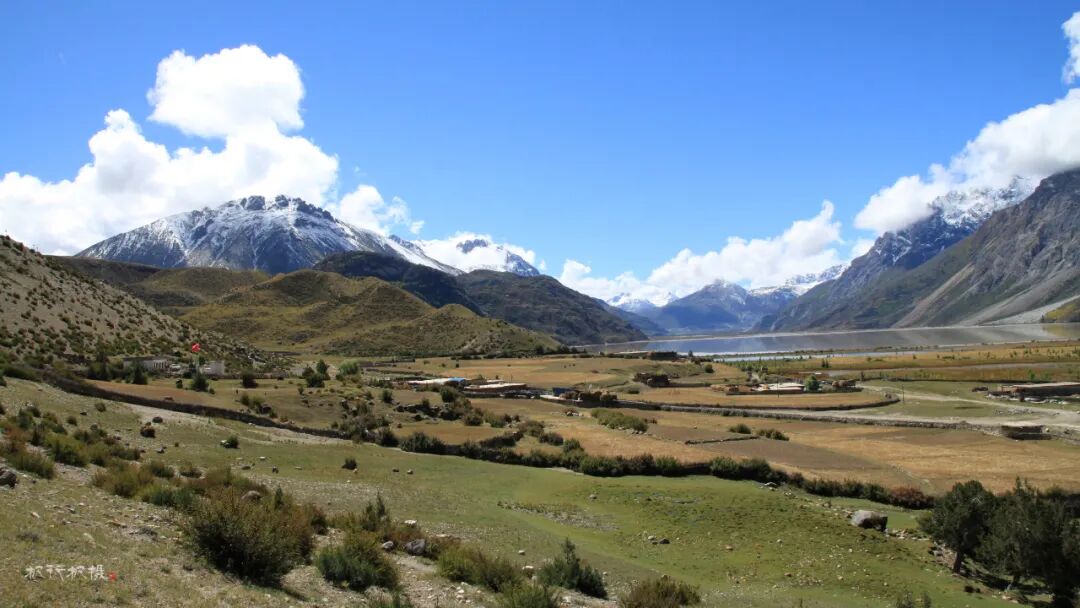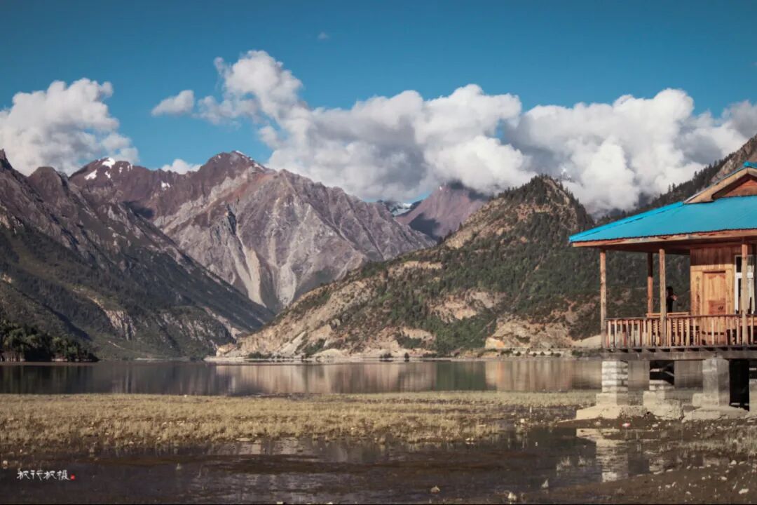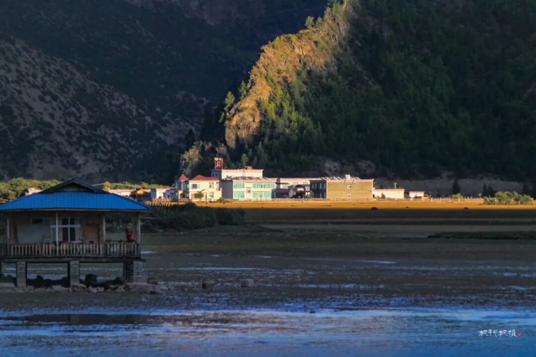 高山下散布着藏族村落,藏族人家依湖而居,湖畔的平地就是他们的田地和草场。石头和木板搭建而成的房舍,古朴且与环境融为一体。每一栋房顶上都插着彩色的经幡,蓝天下经幡随着风飘动。