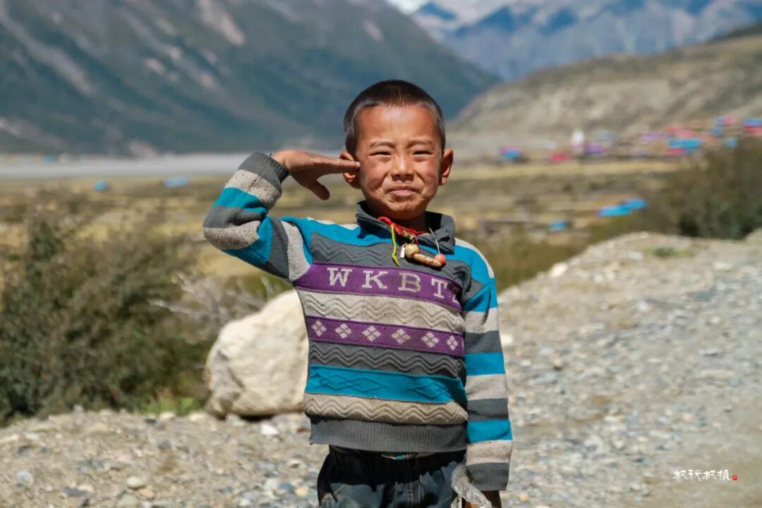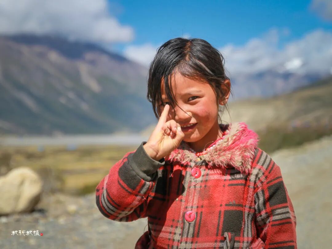 几位藏族小孩在湖边玩耍,当我们下车拍照时,他们马上围过来,充满好奇的目光上下打量。小男孩用不流利的汉语询问我,女孩子怯怯的躲在后面,当我拿出文具和糖果送给他们时,很意外他向我敬了个礼。