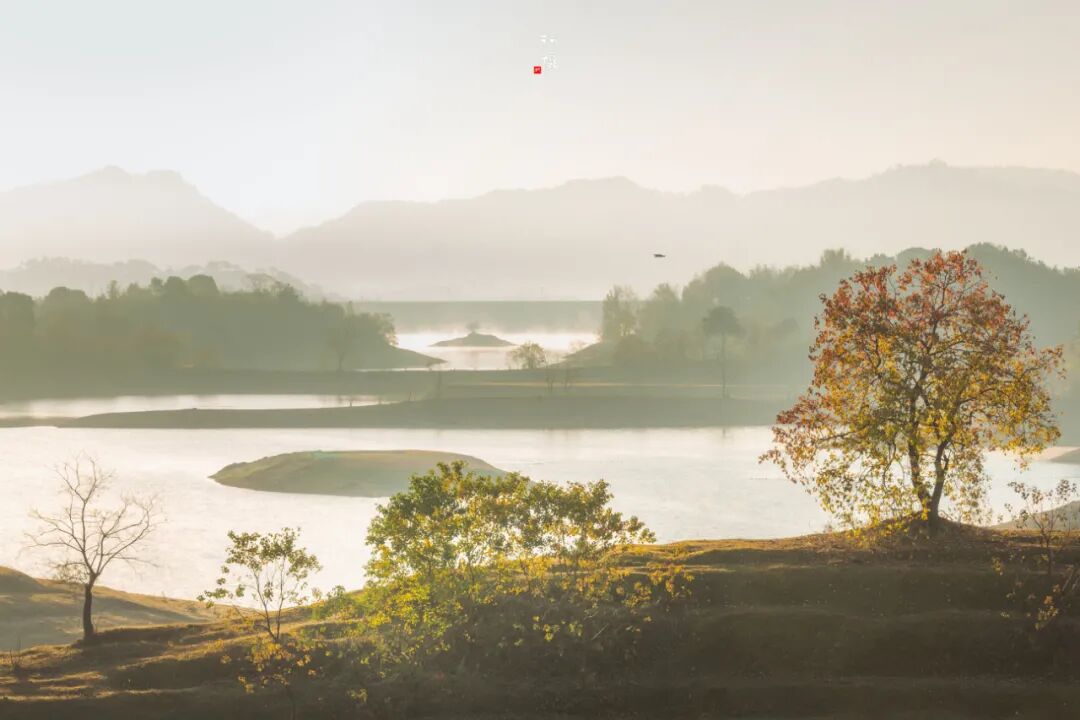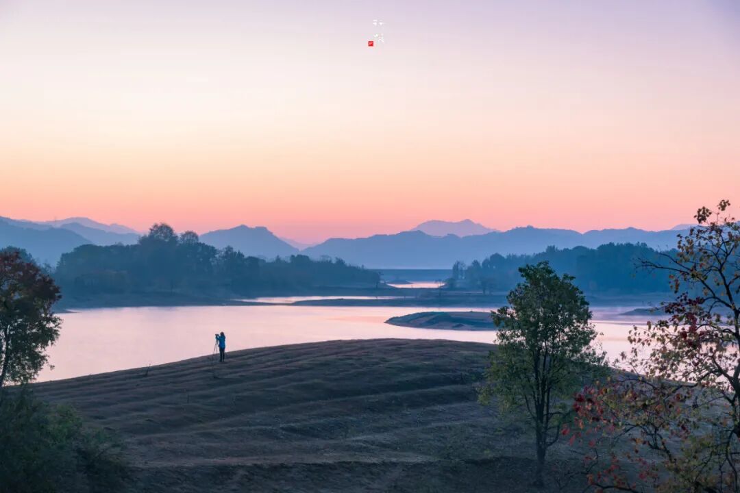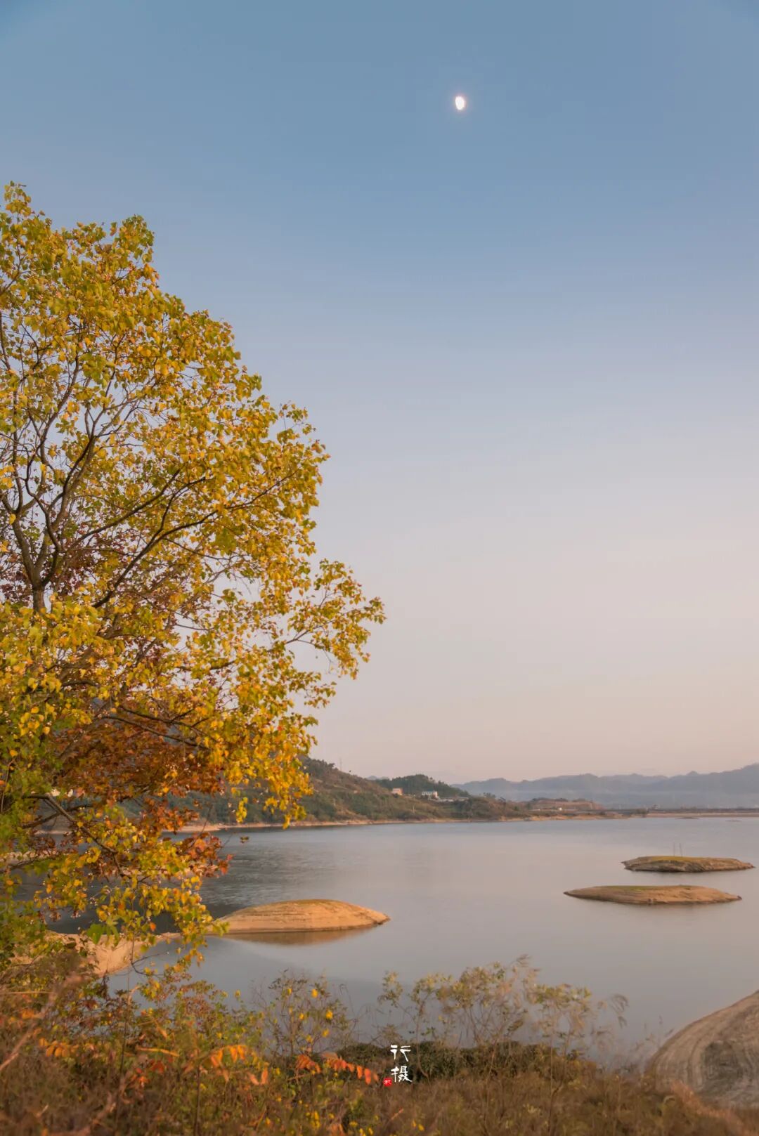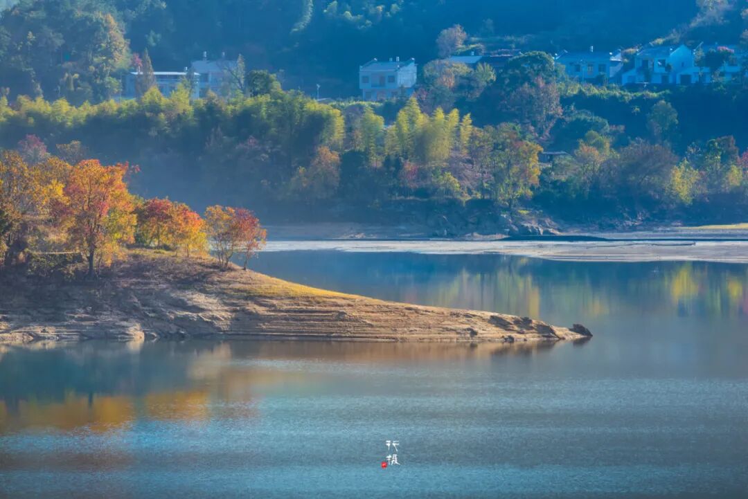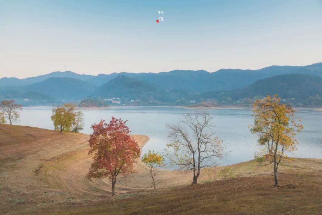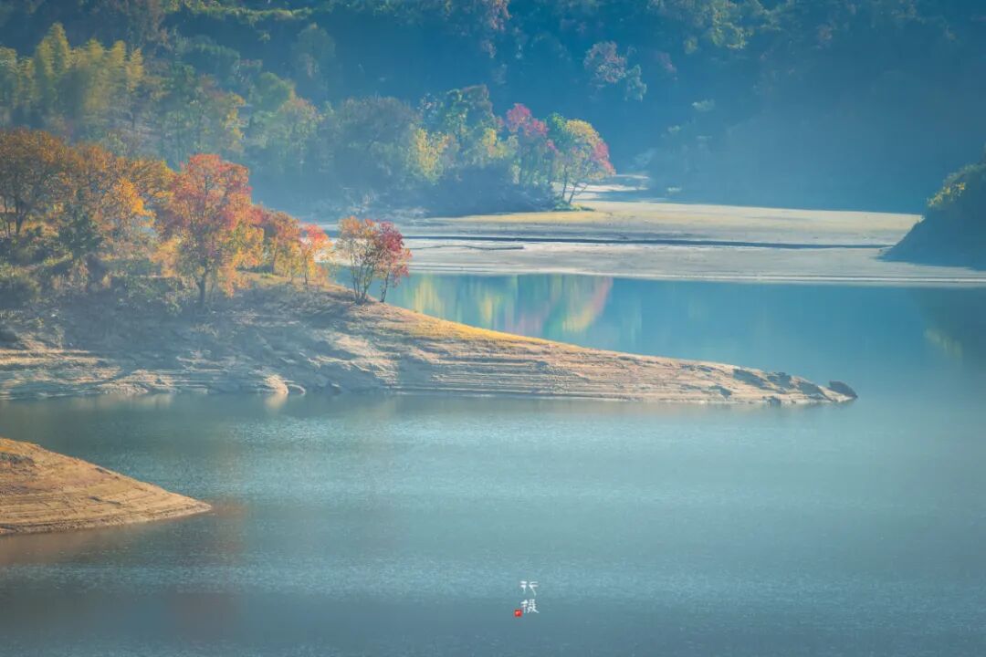 当太阳升起,朝霞照映着彩林,远山层林尽染,库区碧波荡漾,整个七星岛景美如画。
