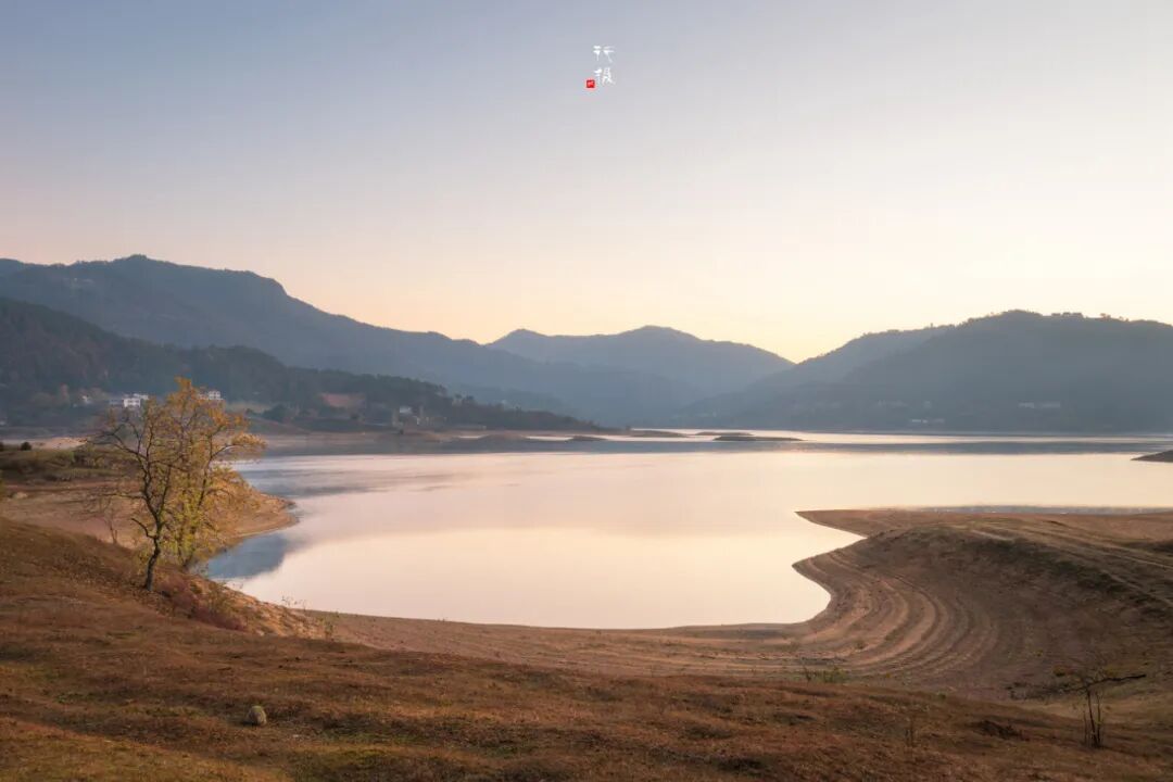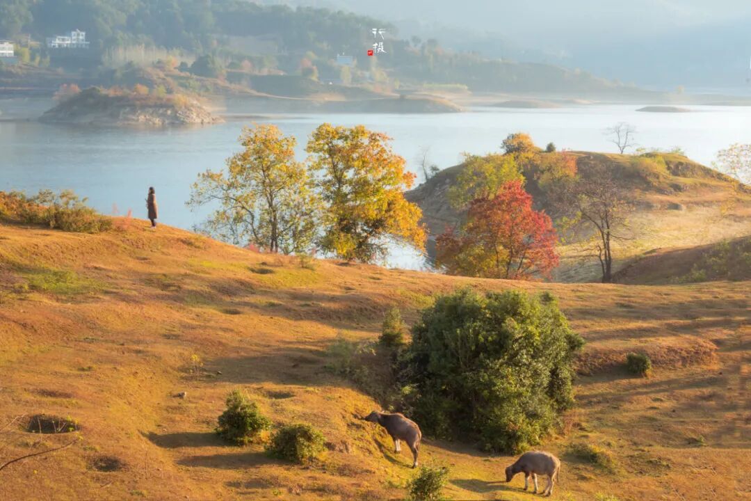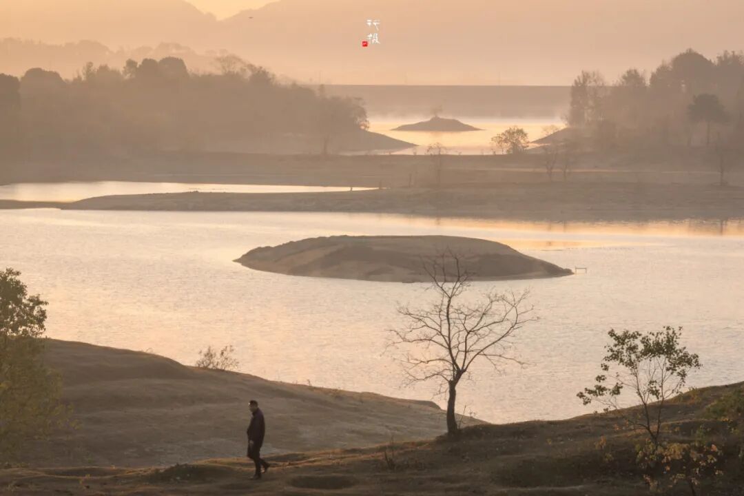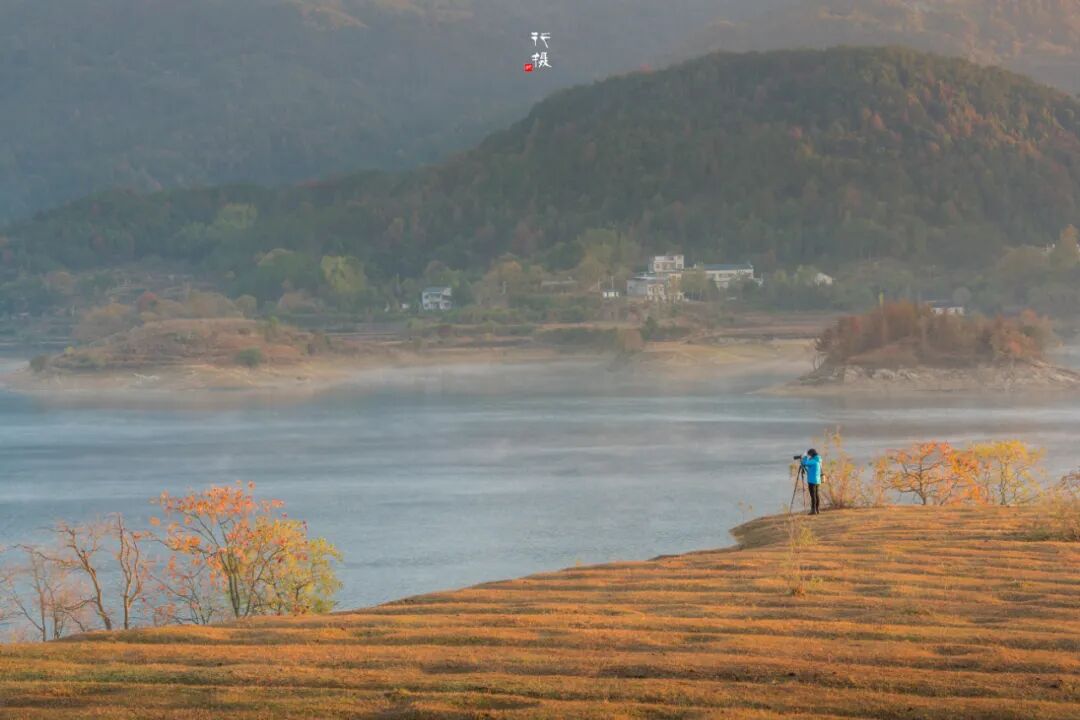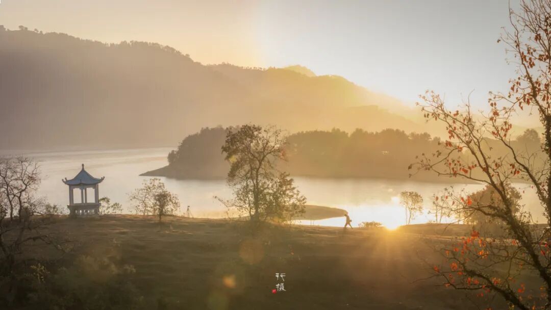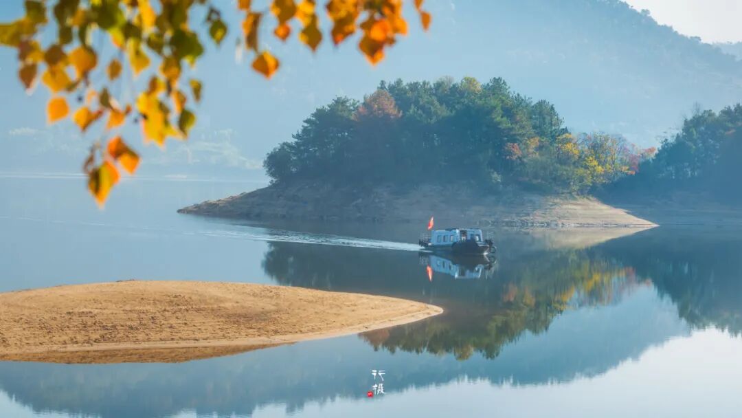 当太阳升起,朝霞照映着彩林,远山层林尽染,库区碧波荡漾,整个七星岛景美如画。