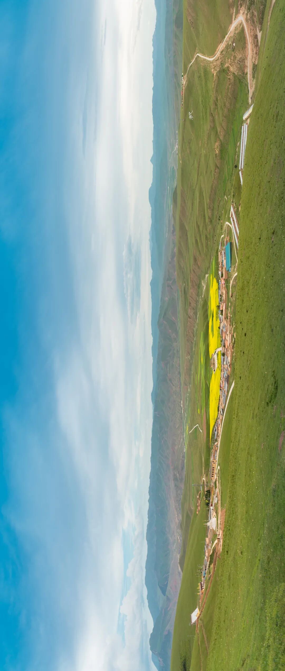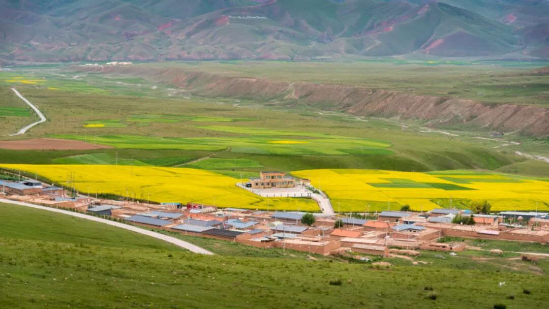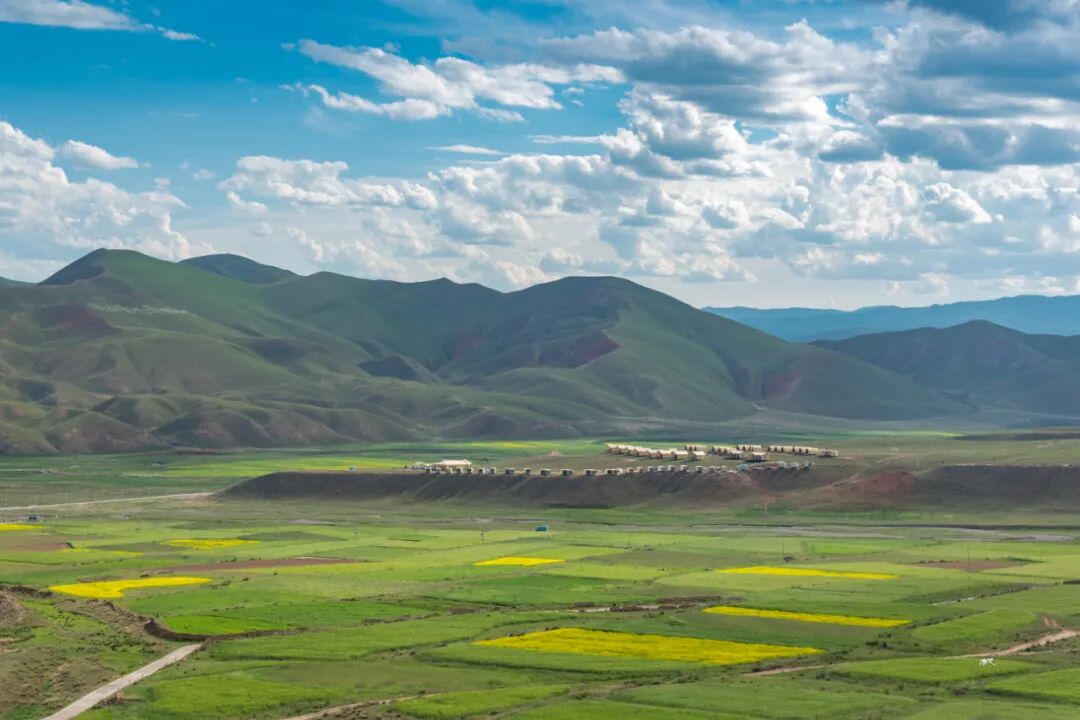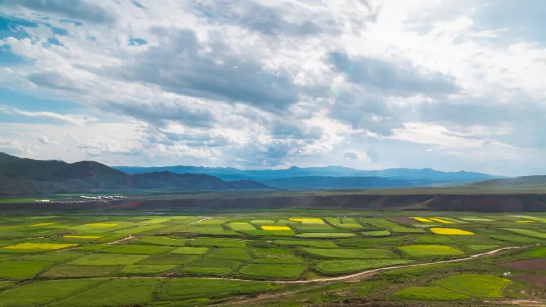 夏季的甘加草原绿草如茵、繁花似锦,牛羊遍野,蓝天白云绿草浑然一体。绿色的草场上偶尔有白色帐篷点缀,景美如画.