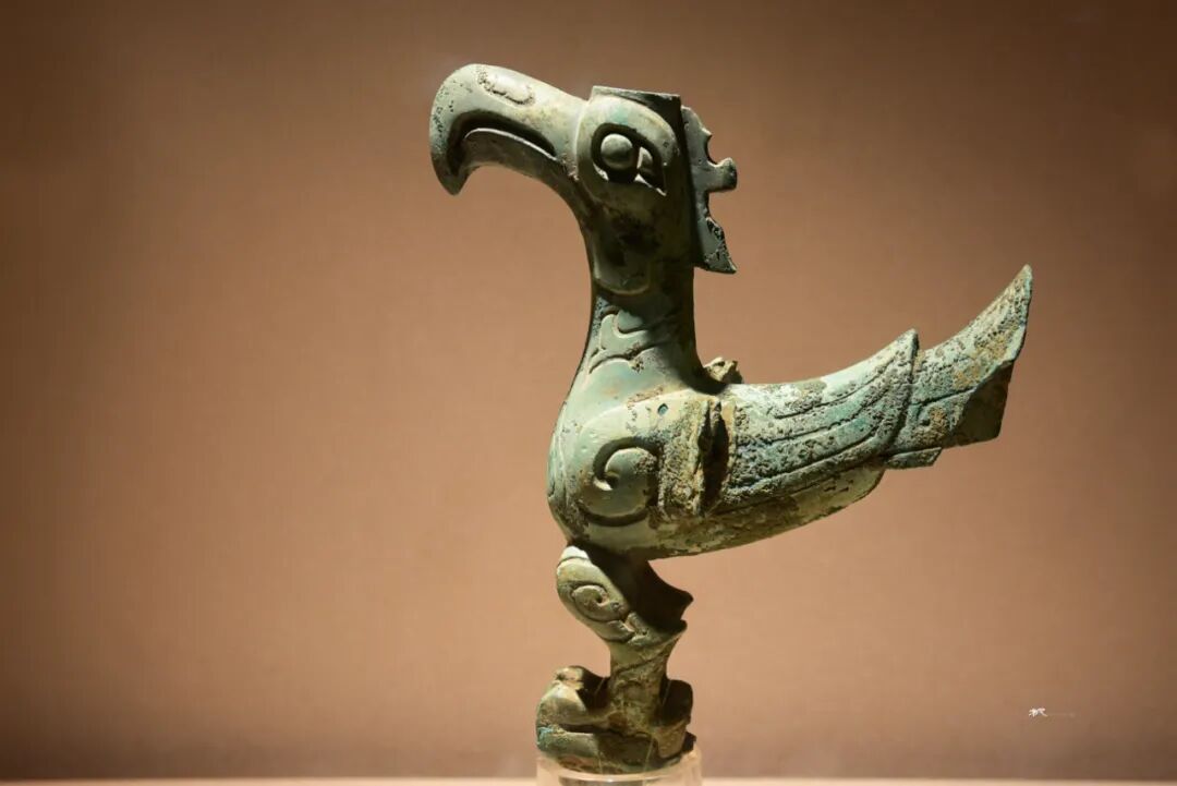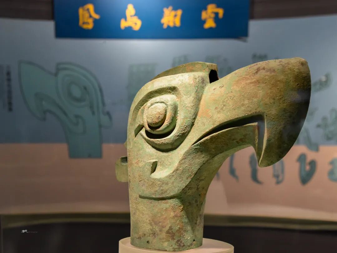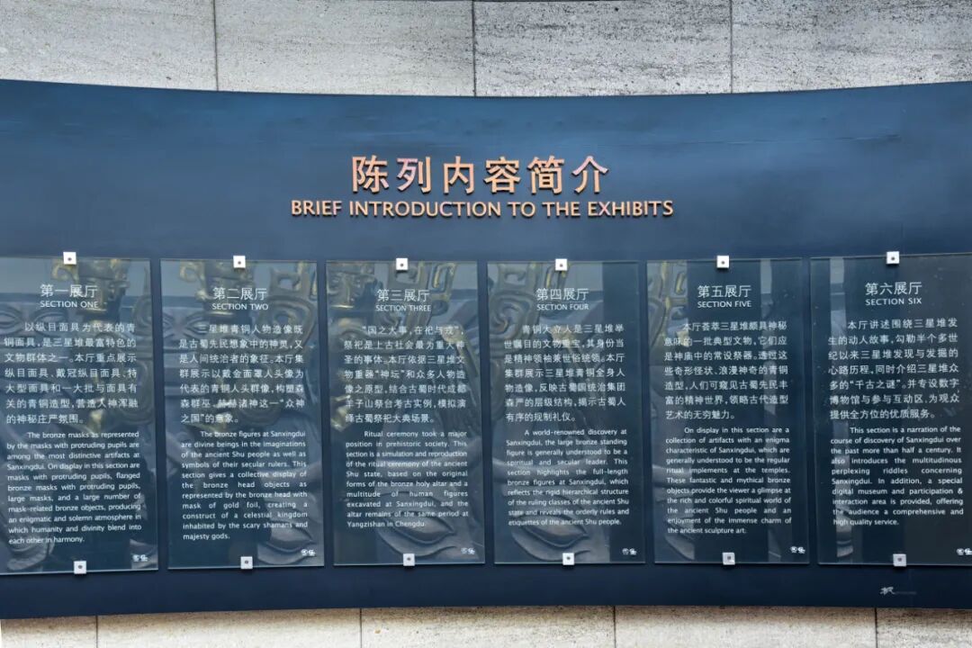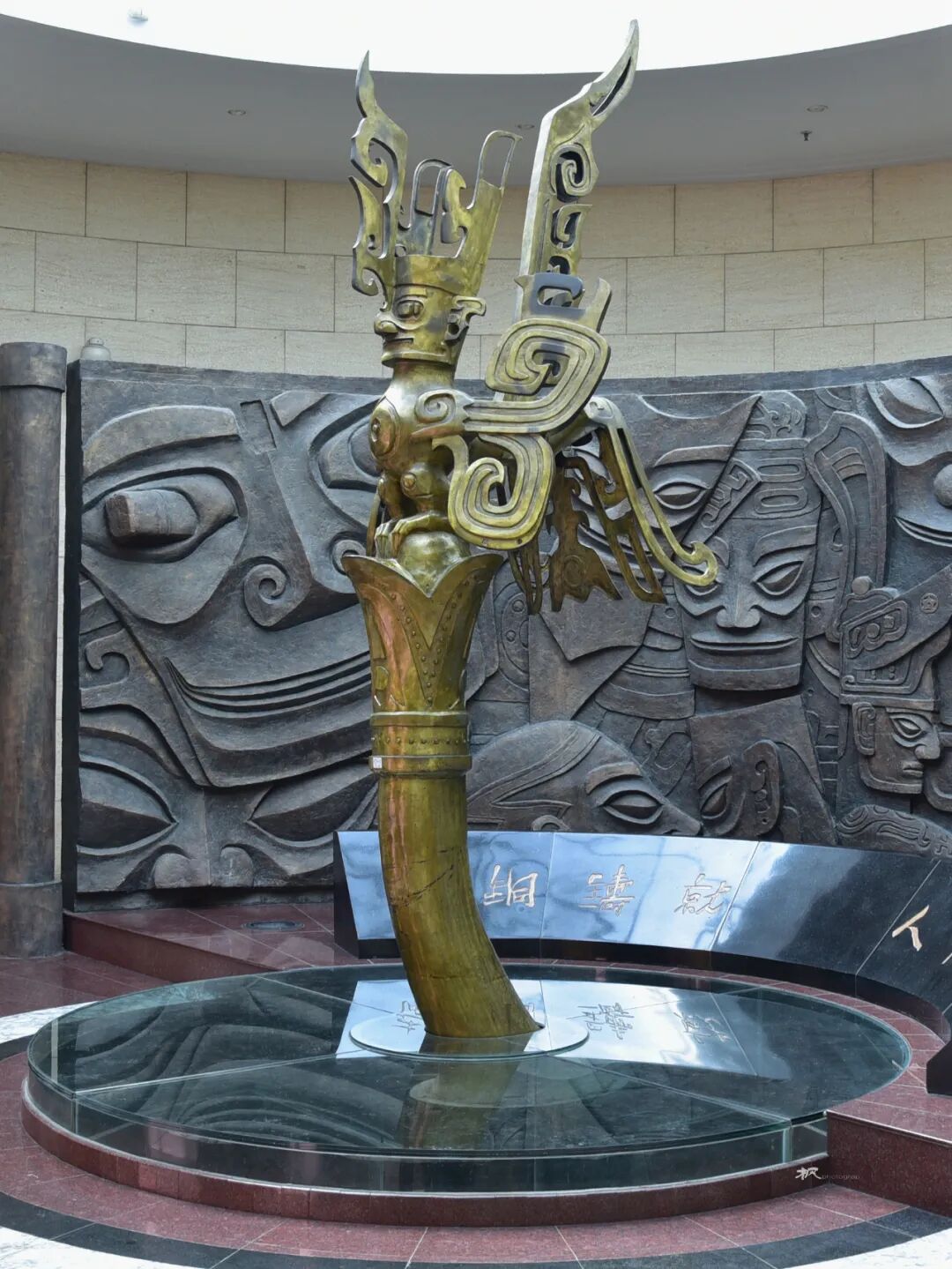 青铜专馆 门厅以青铜人首鸟身像为主体标志性雕塑,背景是大型铜质浮雕背屏,旨在揭示陈列之内容主题——“人与神”,表征古蜀先民的精神追求。