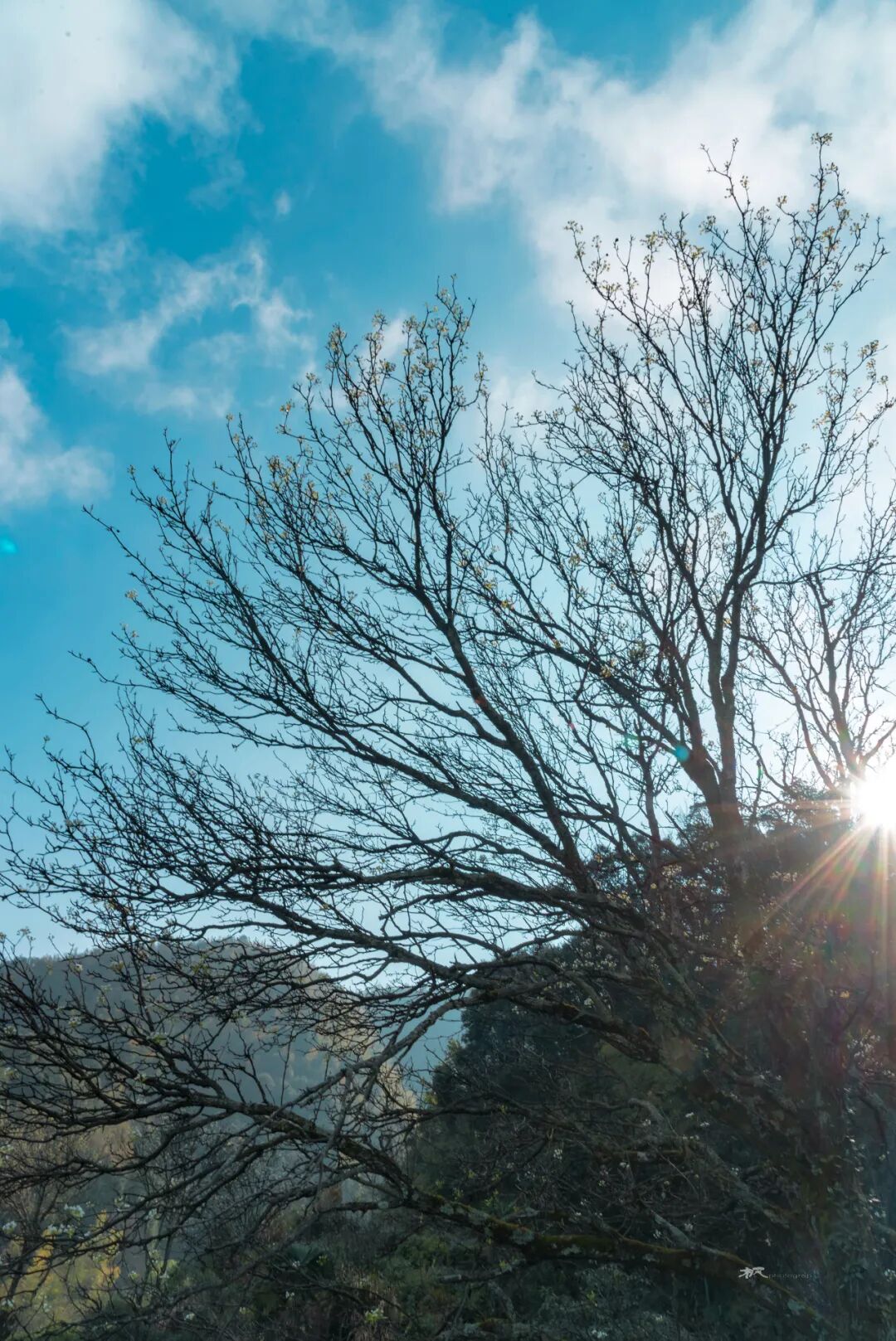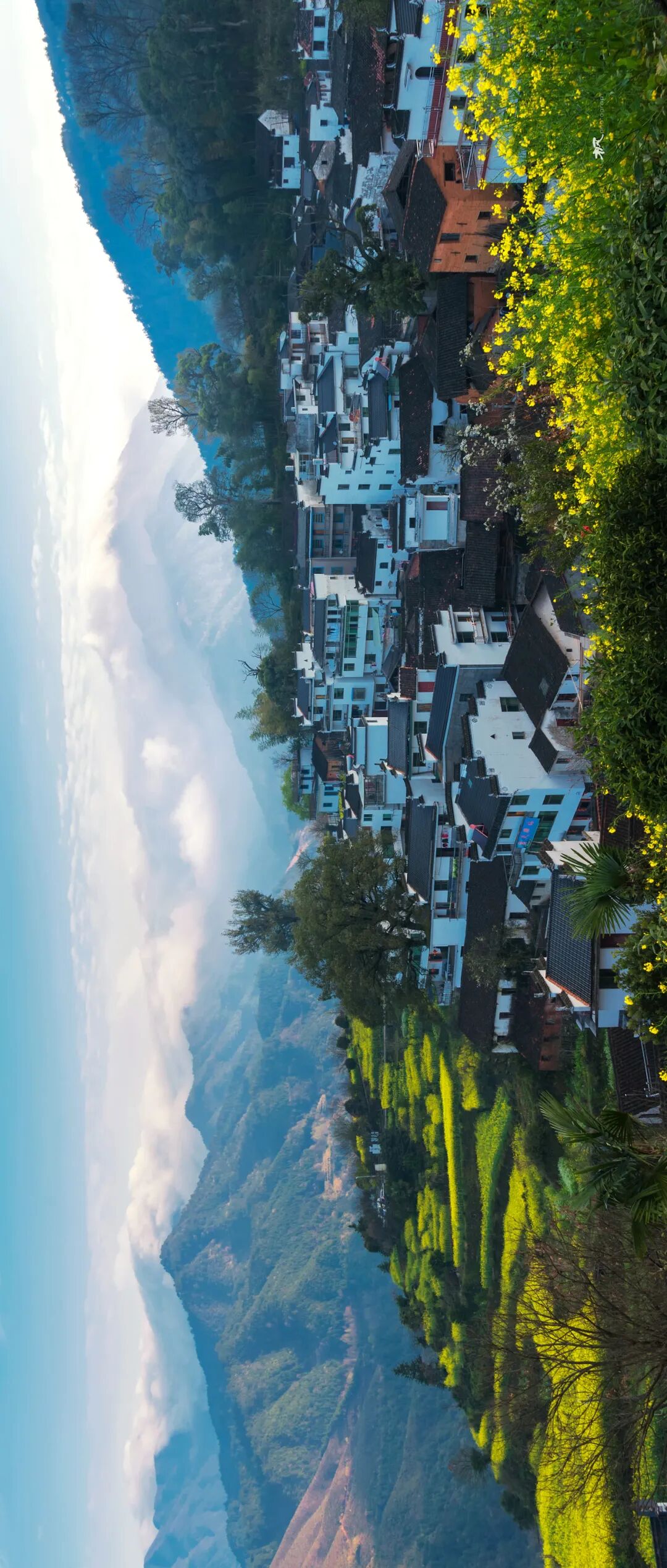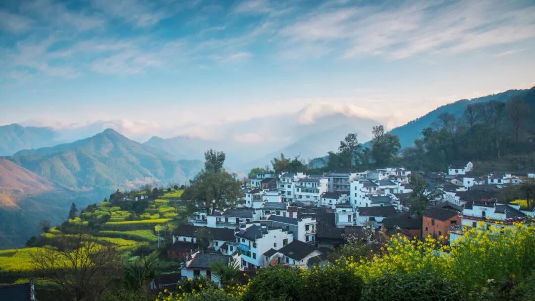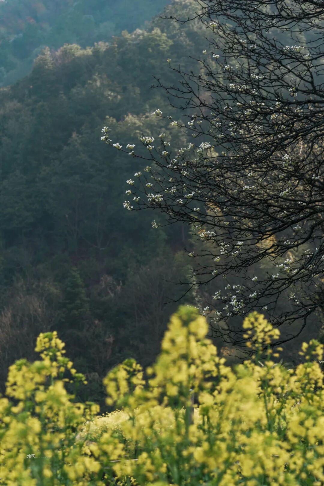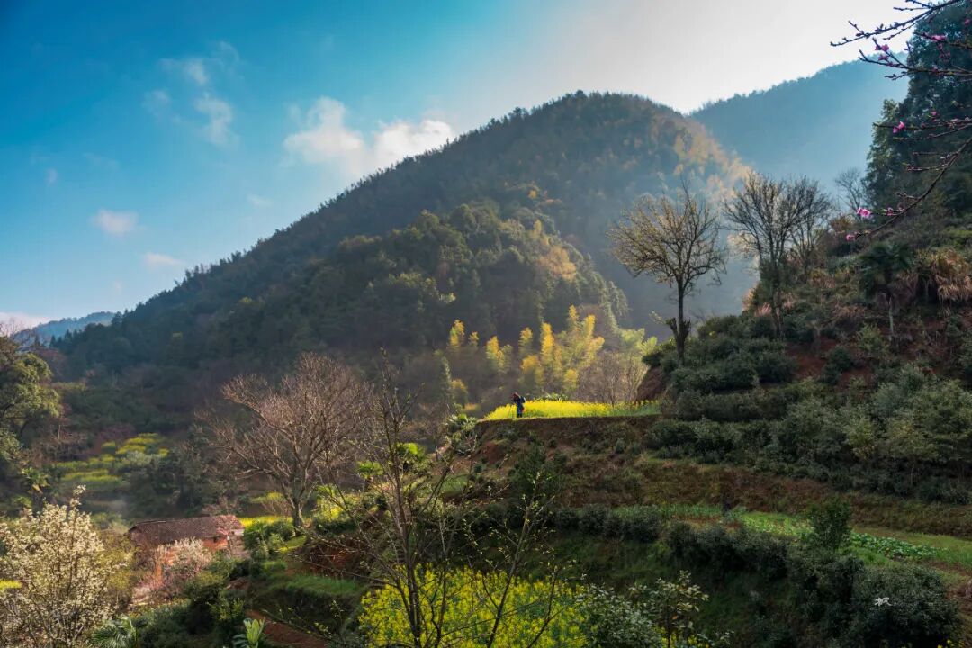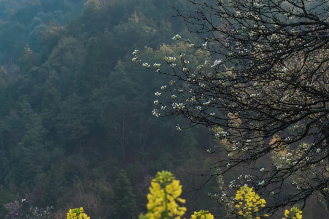 因天气晴朗,没能等到云海萦绕在村落上方的绝佳景色,村后的山坡上桃花刚谢,梨花正开,朝阳洒落在黄色的油菜花、白色的萝卜花以及黄泥土墙黛瓦的村屋上,构成一幅唯美的的画面。