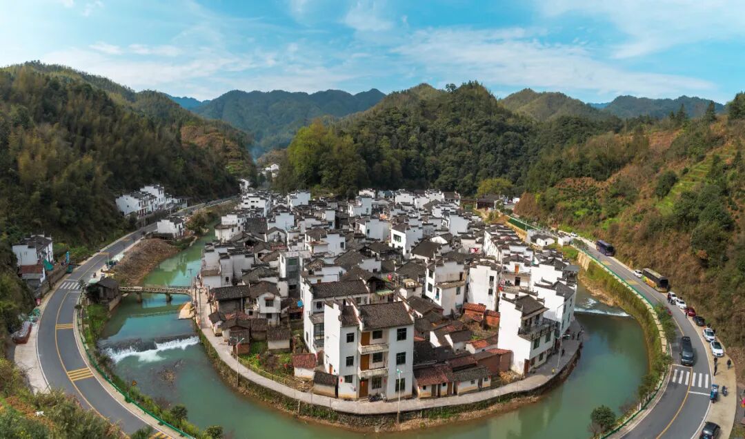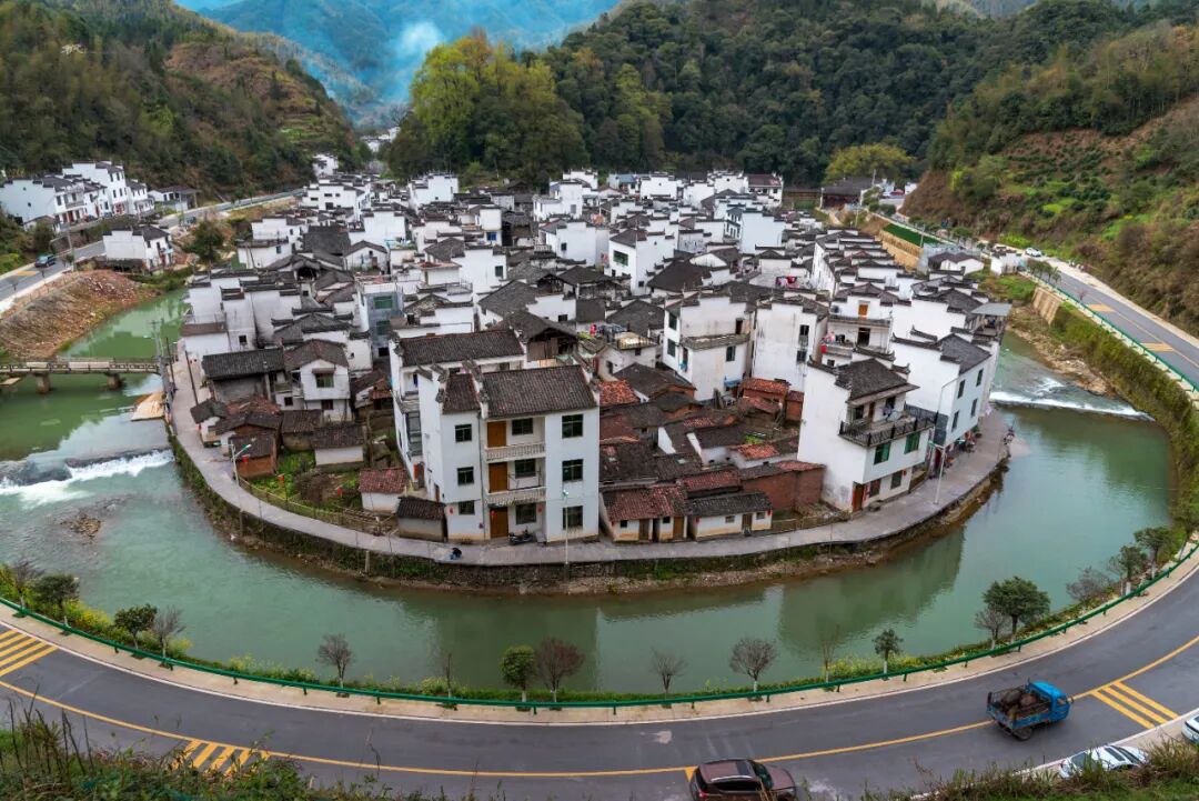 菊径村用山环水绕来形容一点不为过,整个村子密集的布置在一个圆形平地上,一条小河绕村庄将近一周,看上去就是一个完整的圆形,小河外侧是环村而建的沥青公路,公路四周为高山环绕。