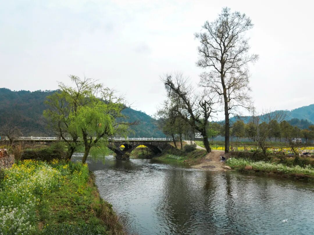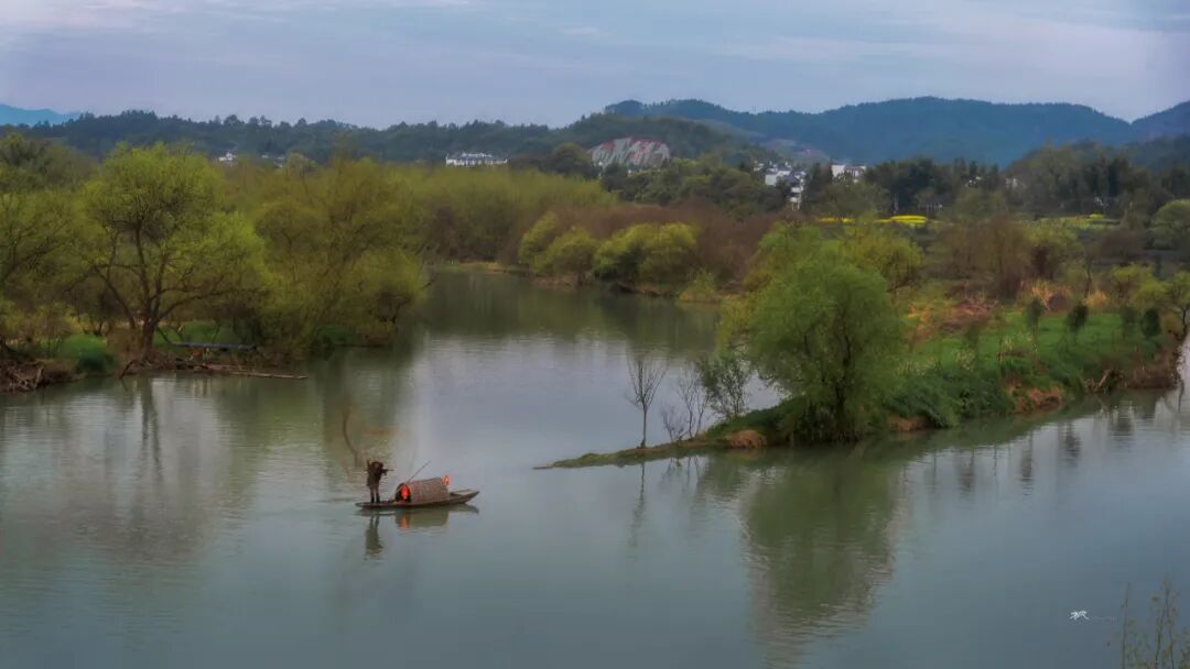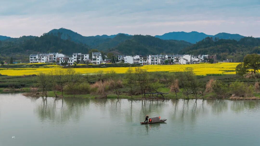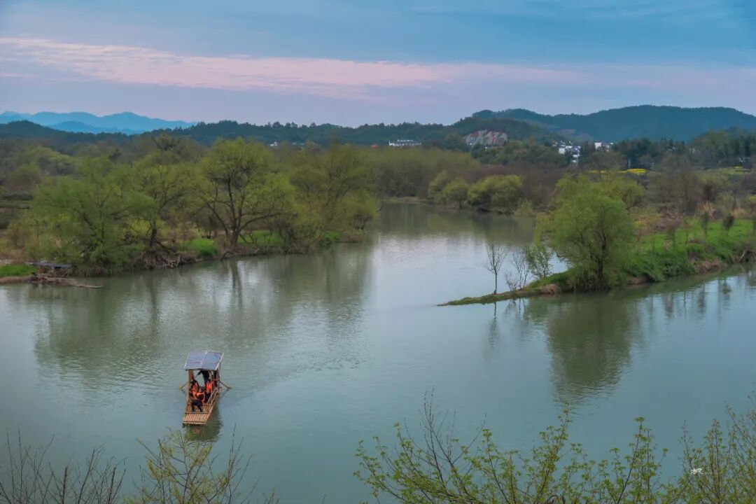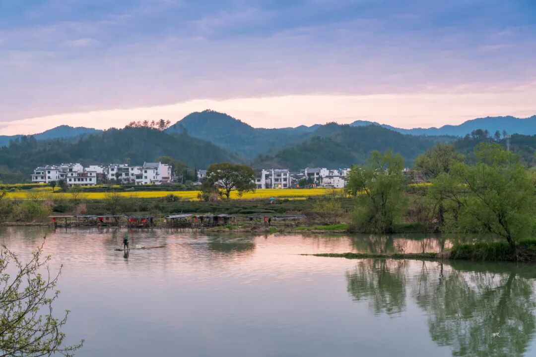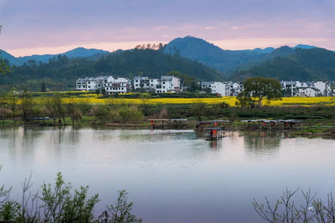 三月春深,站在河对岸高处放眼望,远处青山碧水,近处小桥人家,粉墙黛瓦的民居和金灿灿的菜花浑然天成,让人联想到陶渊明笔下的世外桃源。坐在岸边看晚霞,天色渐暗,一叶小舟划过,船头红灯笼点亮,透着水墨丹青的韵味。