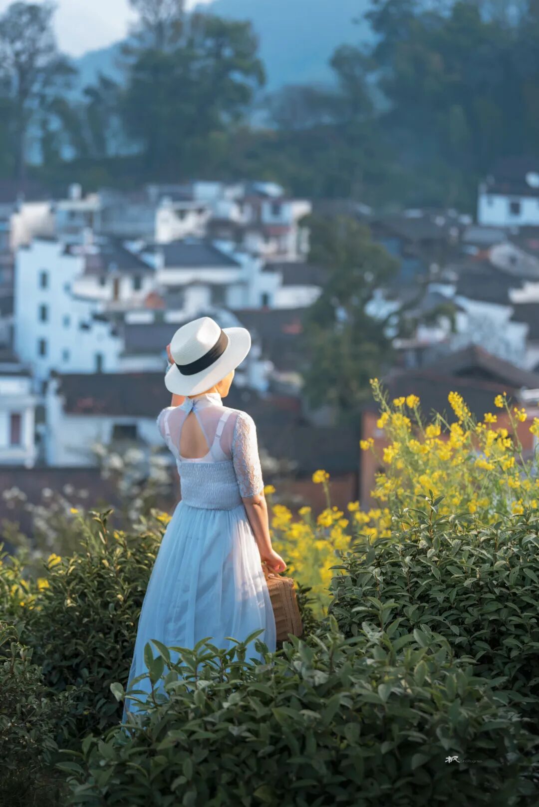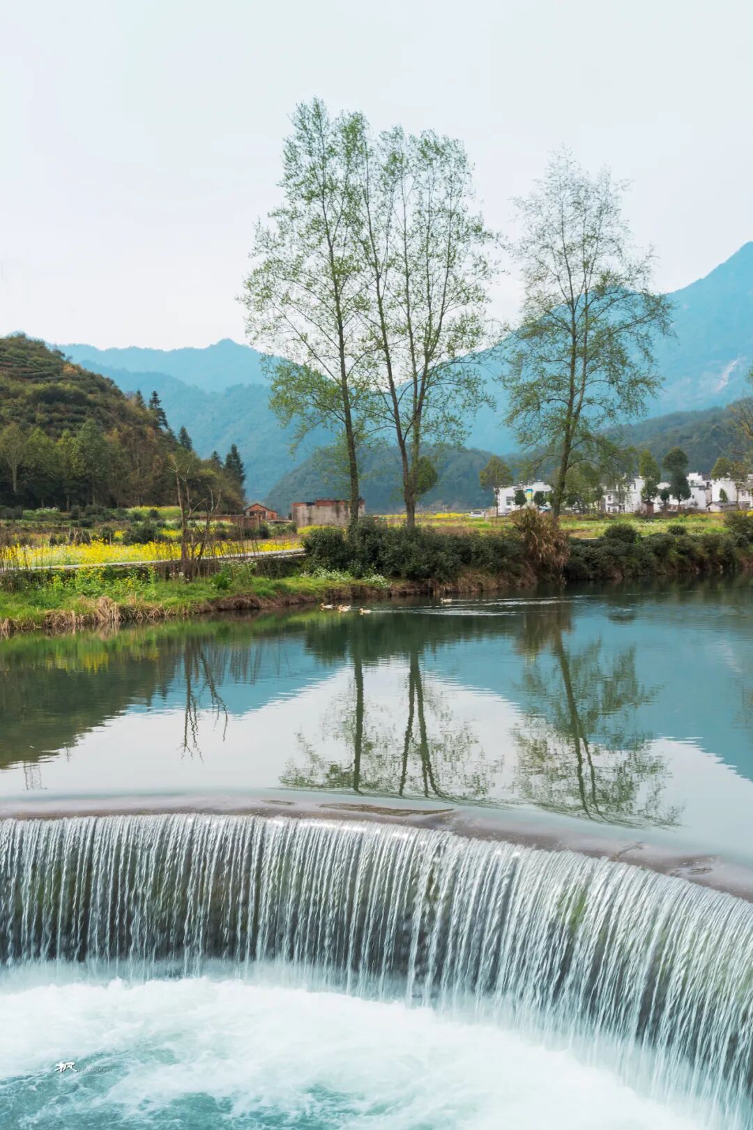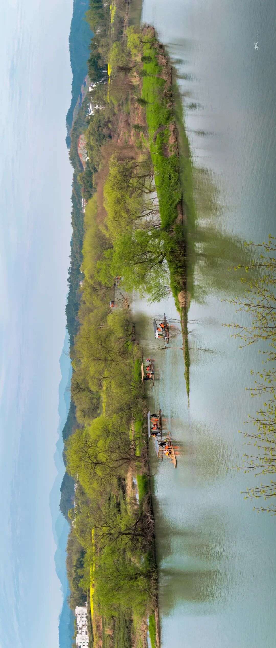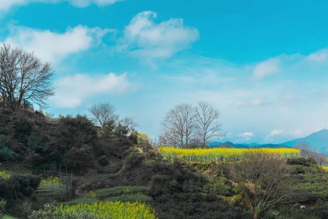 三月春深,站在河对岸高处放眼望,远处青山碧水,近处小桥人家,粉墙黛瓦的民居和金灿灿的菜花浑然天成,让人联想到陶渊明笔下的世外桃源。坐在岸边看晚霞,天色渐暗,一叶小舟划过,船头红灯笼点亮,透着水墨丹青的韵味。