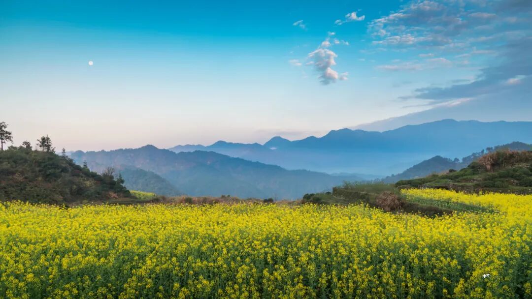 查平坦的夜很宁静,早早便醒来,喊上房东的儿子给我们当向导,带我们去找拍摄点。我们在蜿蜒的山路上穿行,小路的两侧是麦地和油菜花田,一垅垅花的金黄与麦的碧绿铺在山岭上很美。远处的峰峦掩映在云雾之中,一轮圆月还挂在空中。