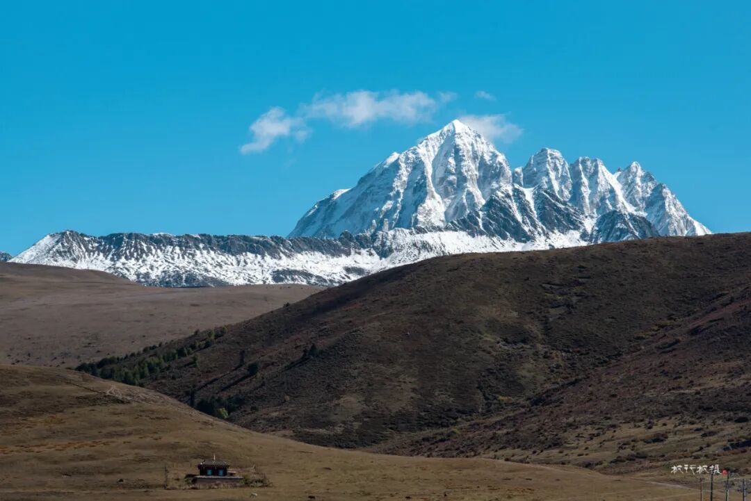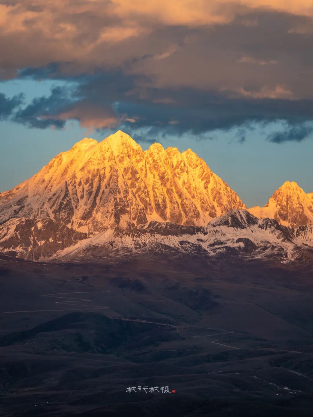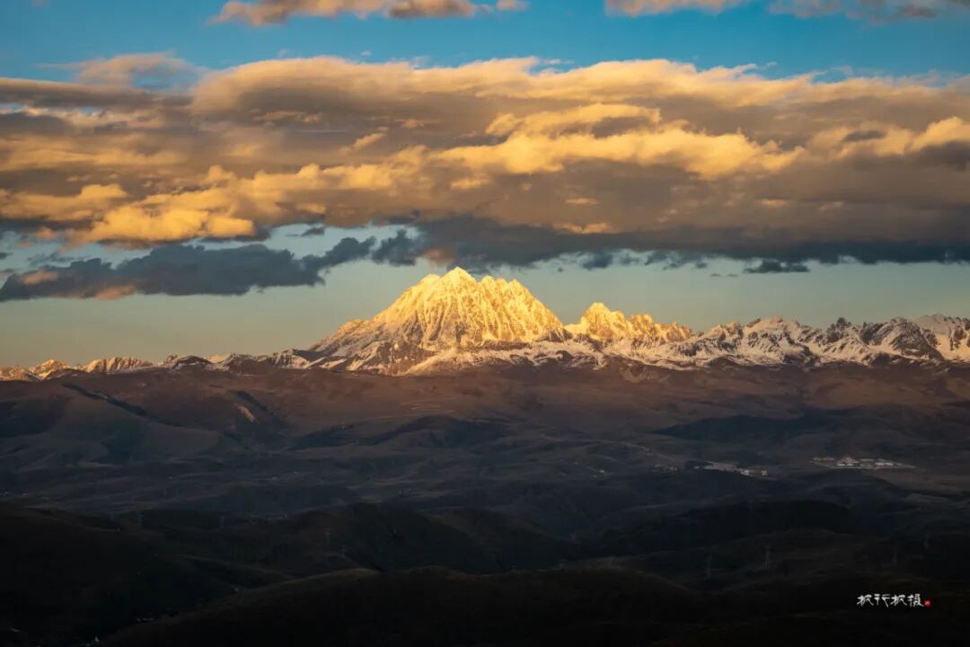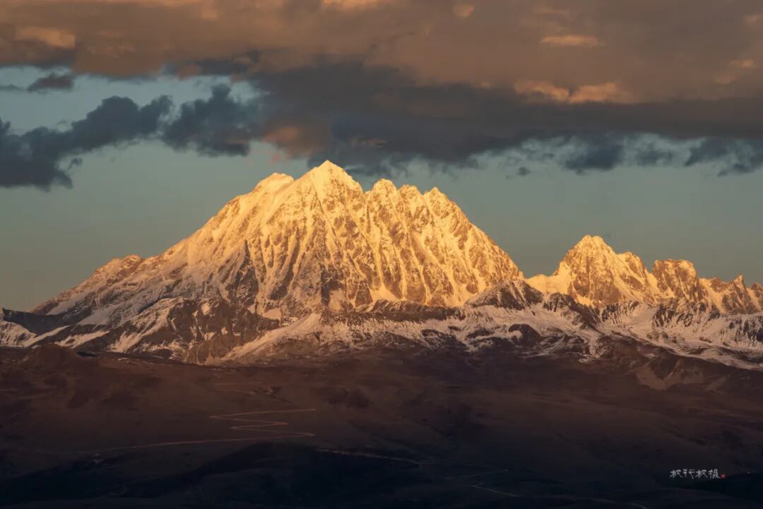 亚拉雪山下有一片宏大的寺院,那便是木雅大寺,寺院在夕阳中闪烁着金光。木雅大寺山后有一条小路沿着山脊盘旋而上,一直到亚拉雪山下的山口。为了更近的仰望雪山,第二天一早就赶去云绕亚拉观景台,想和亚拉雪山来了一次近距离对望,终因山路过于艰险半途而废。