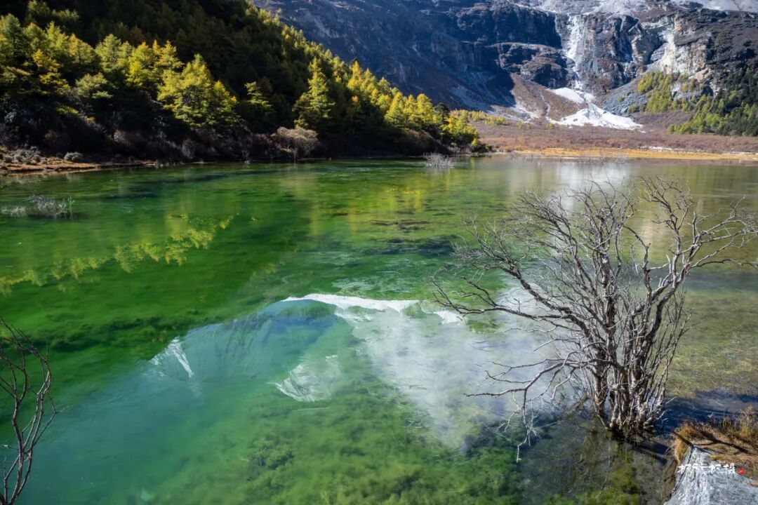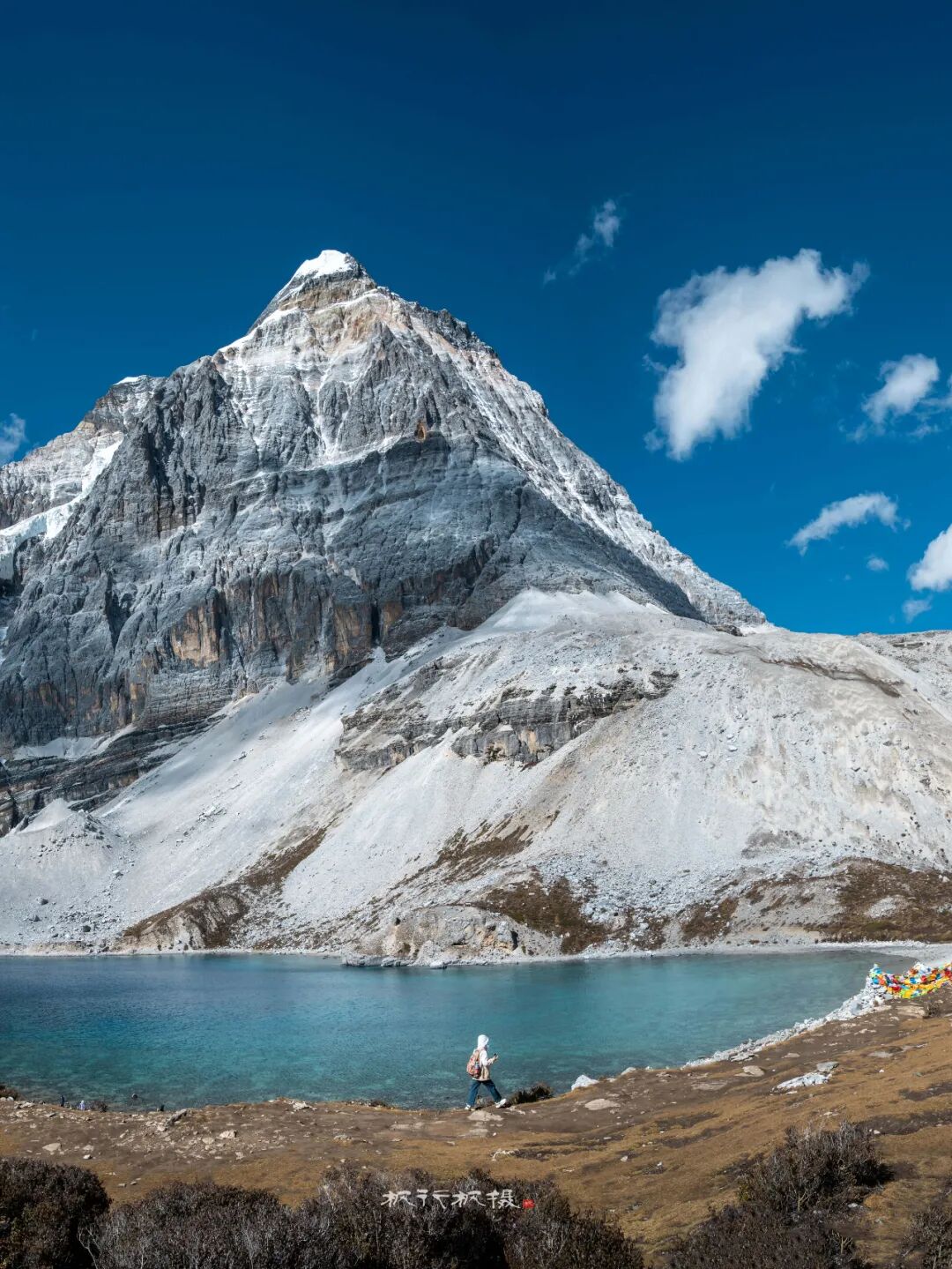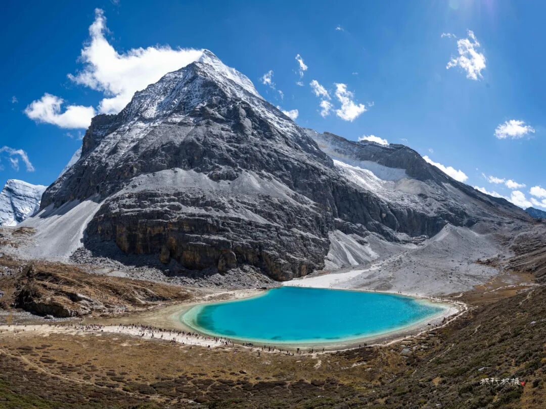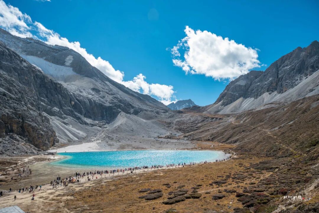 央迈勇山脚下一个古冰川湖,四周雪山环绕,湖水清莹碧蓝,以其玲珑秀雅、水色翠蓝而著名。每年春暖花开之时,湖水会像牛奶一样洁白如琼浆,并因此得名牛奶海。秋天的牛奶海,在蓝天白云、雪山枯草之间,就这么出现一片蓝汪汪的碧绿海子,真的不是天上掉下来的翡翠。