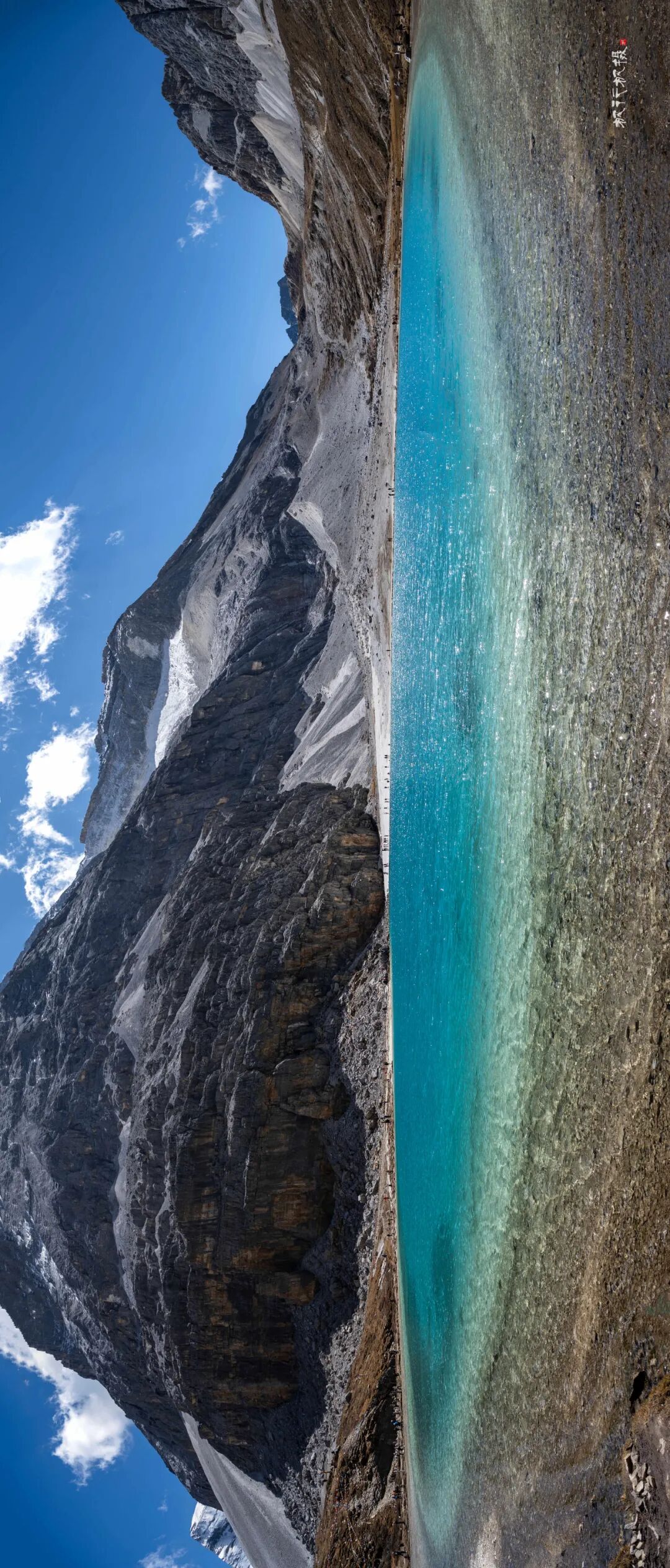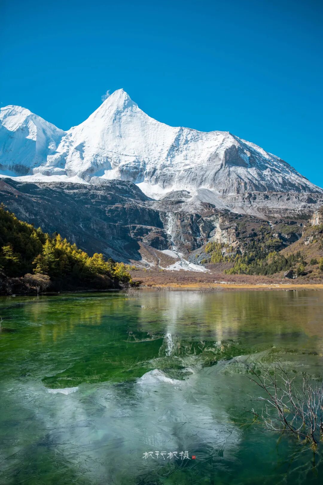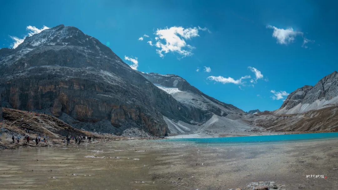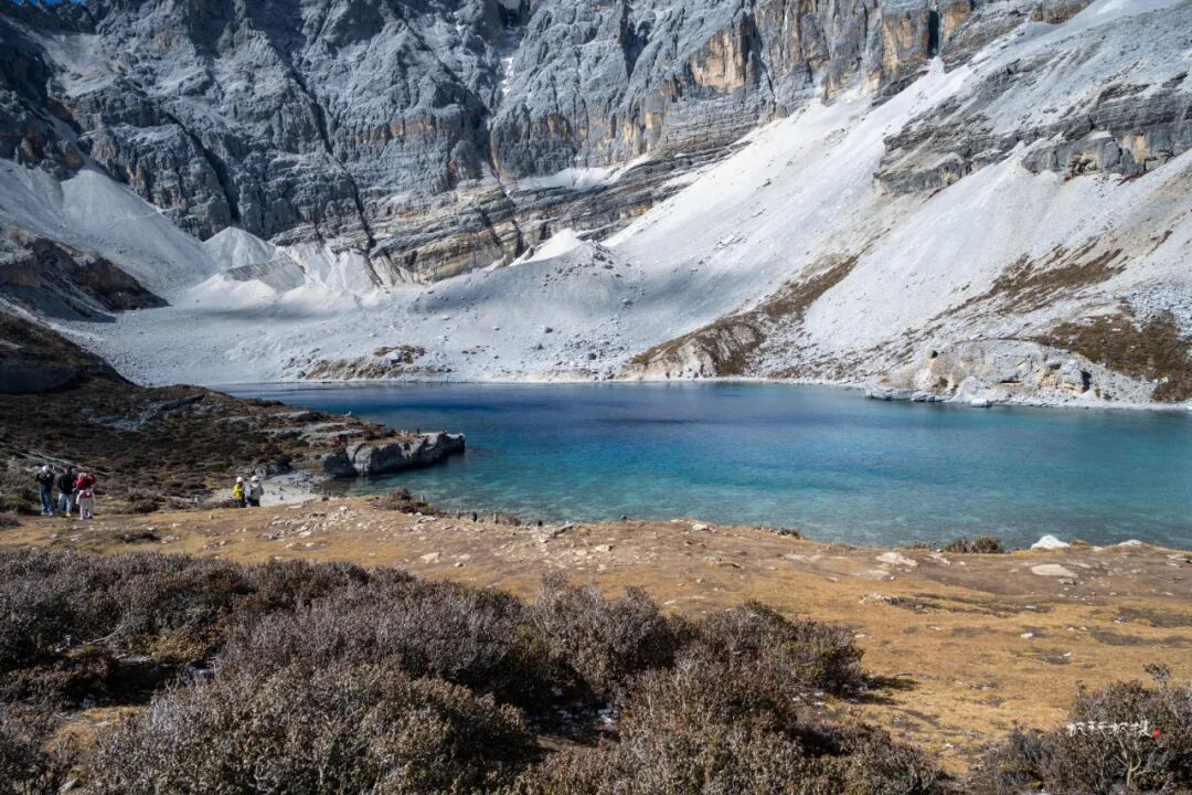 央迈勇山脚下一个古冰川湖,四周雪山环绕,湖水清莹碧蓝,以其玲珑秀雅、水色翠蓝而著名。每年春暖花开之时,湖水会像牛奶一样洁白如琼浆,并因此得名牛奶海。秋天的牛奶海,在蓝天白云、雪山枯草之间,就这么出现一片蓝汪汪的碧绿海子,真的不是天上掉下来的翡翠。
