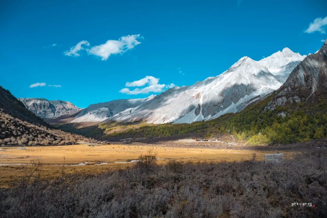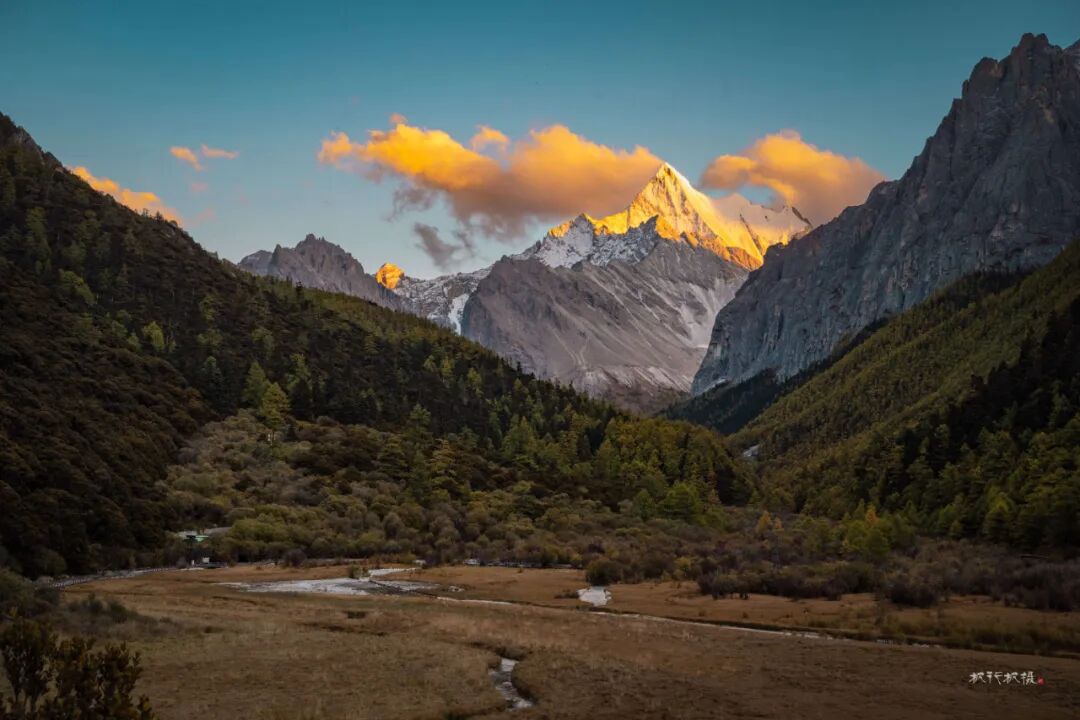 清晨的稻城亚丁的洛绒牛场和央迈勇神山
