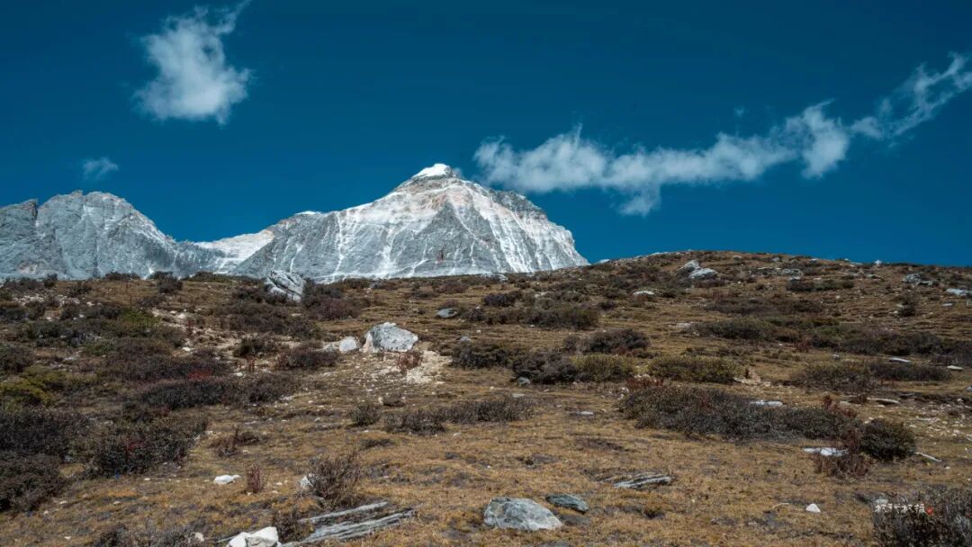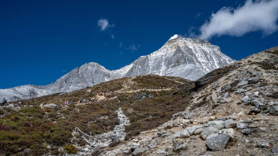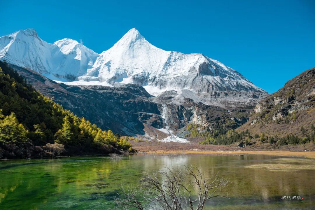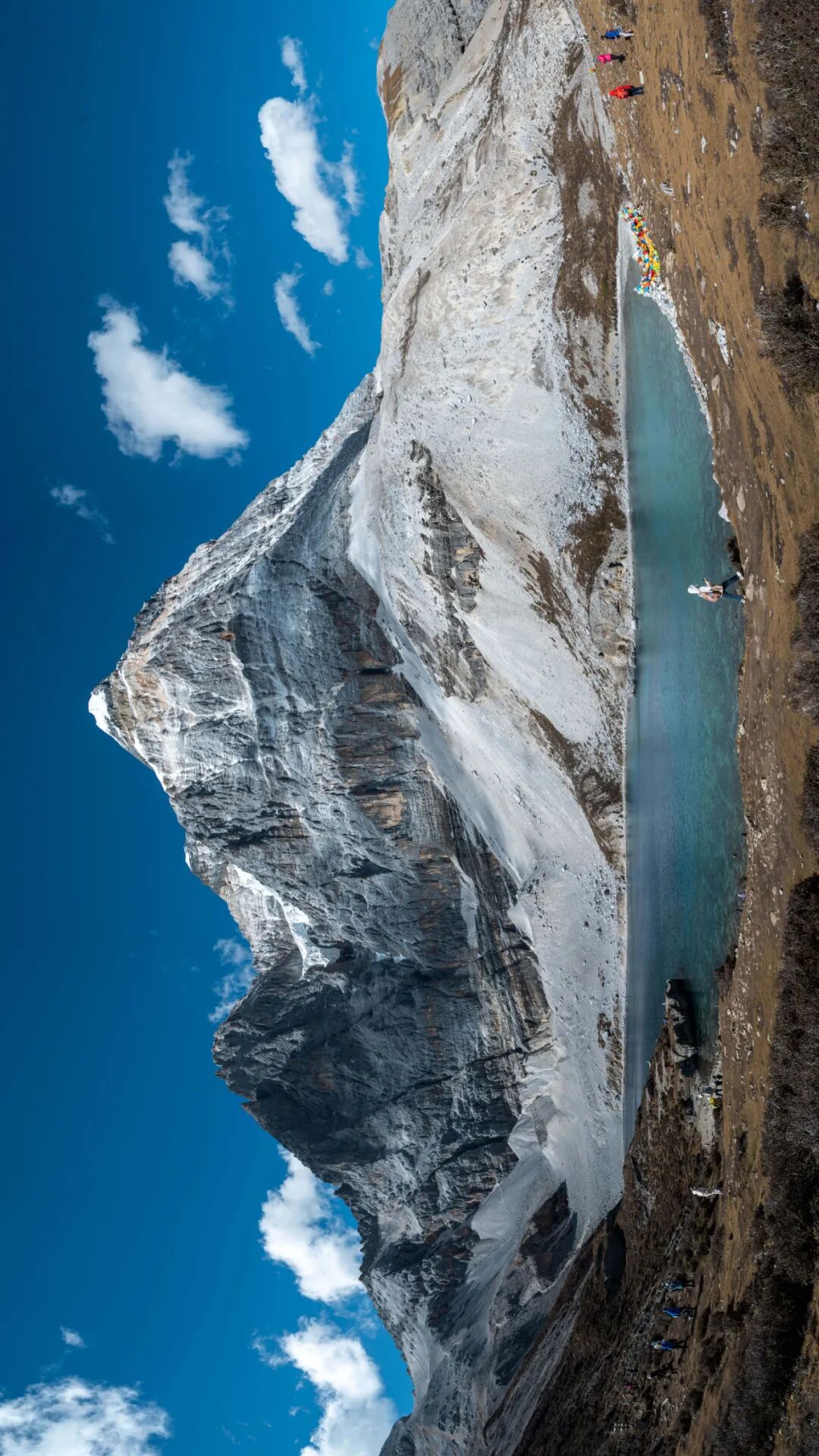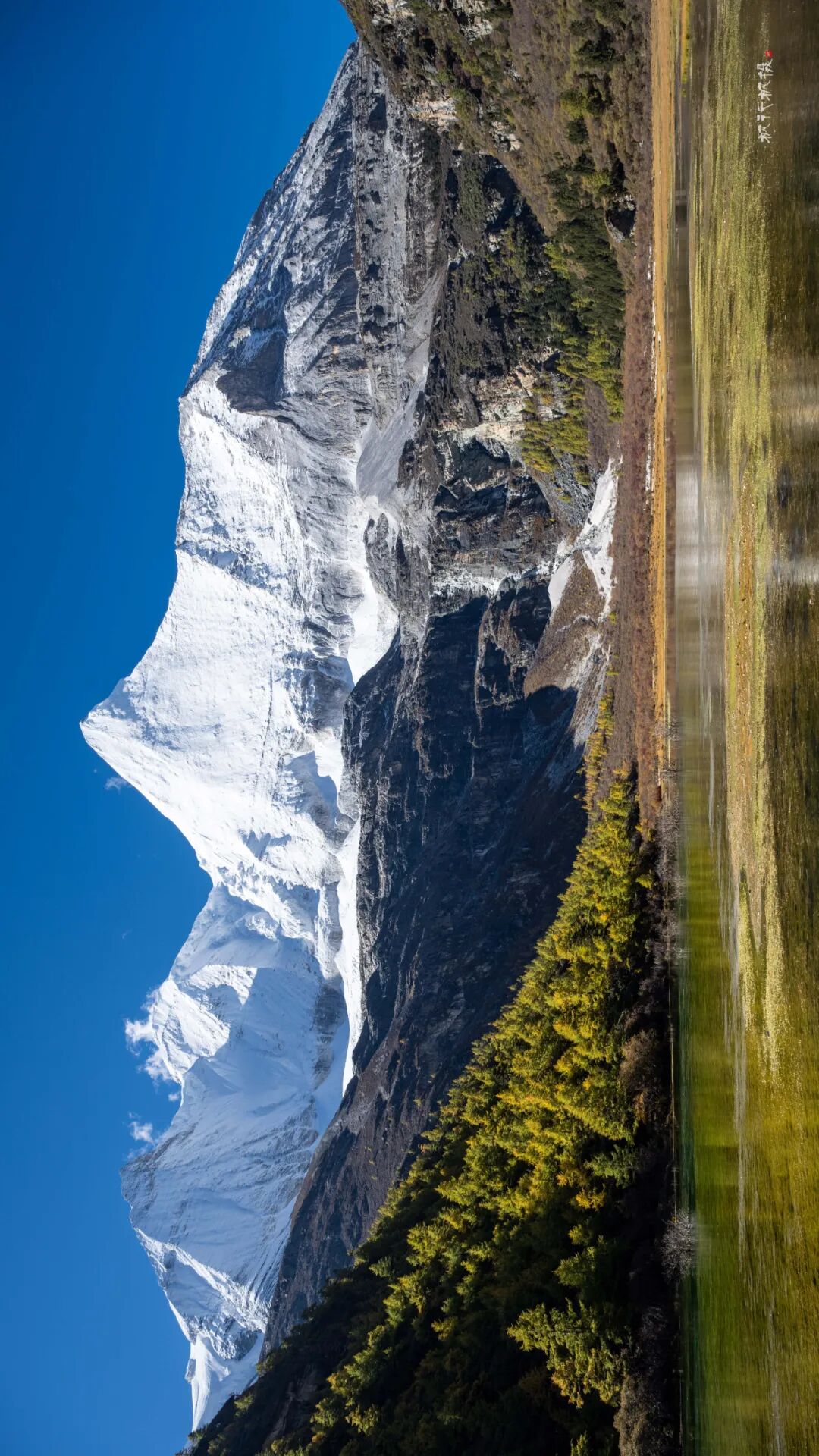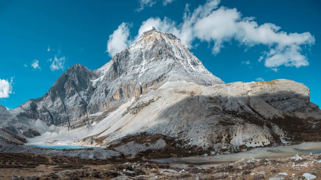左侧雪山是夏诺多吉神山,夏诺多吉,意为“金刚手菩萨”。在三座雪山中造型中最接近金字塔,沿雪山两翼锋利的刃脊蜿蜒绵亘,刃脊背向光线的一侧呈暗影,蓝天中所勾勒出的线条尖锐有型。