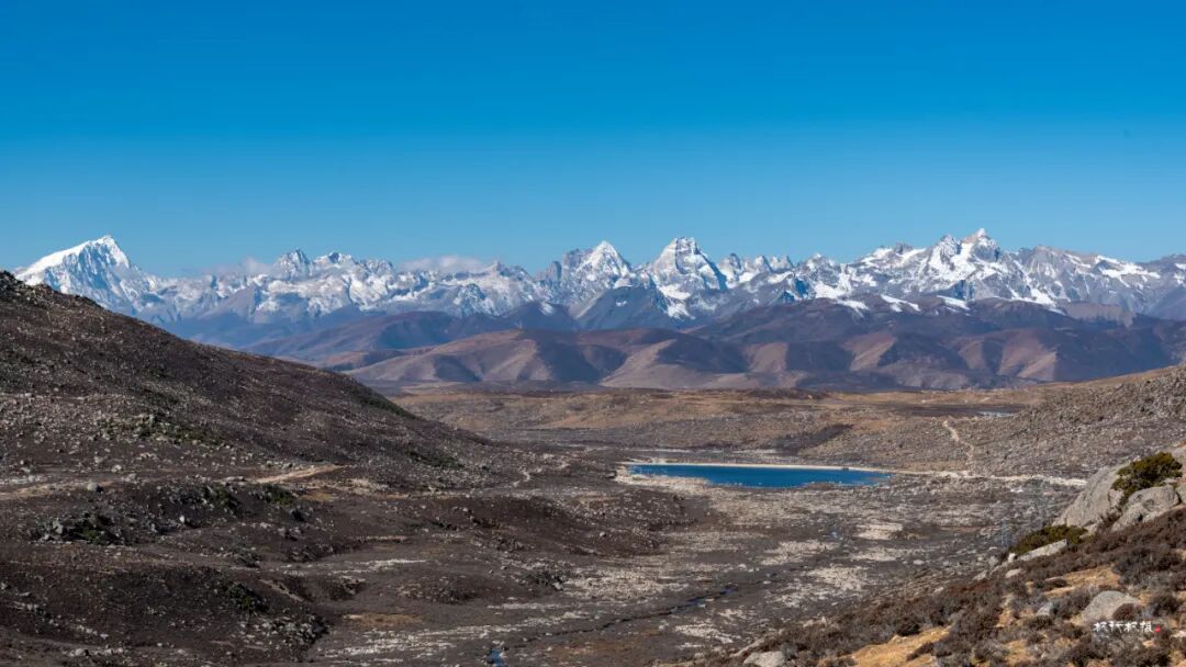 从铁匠山垭口眺望去格聂神山群峰,群峰犹如一道巨大的屏障,横亘在蓝天之下。画面中从左至右分别是格聂神山,肖扎峰和喀麦隆。
