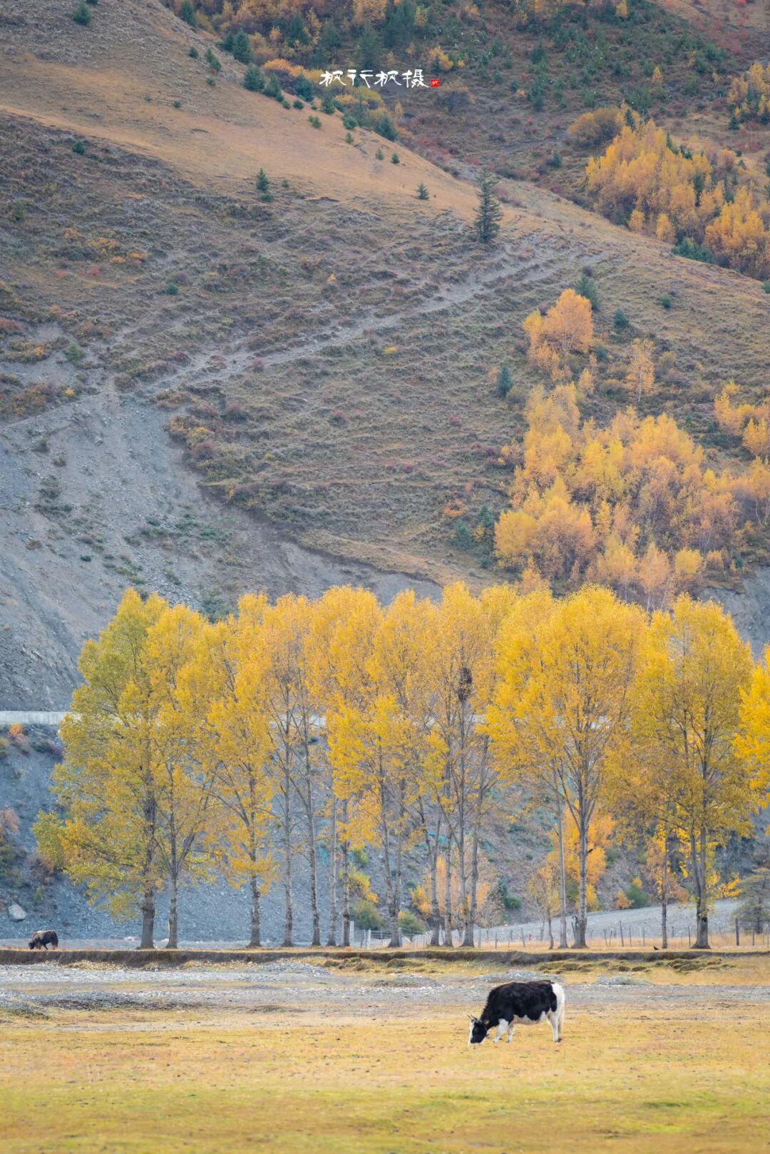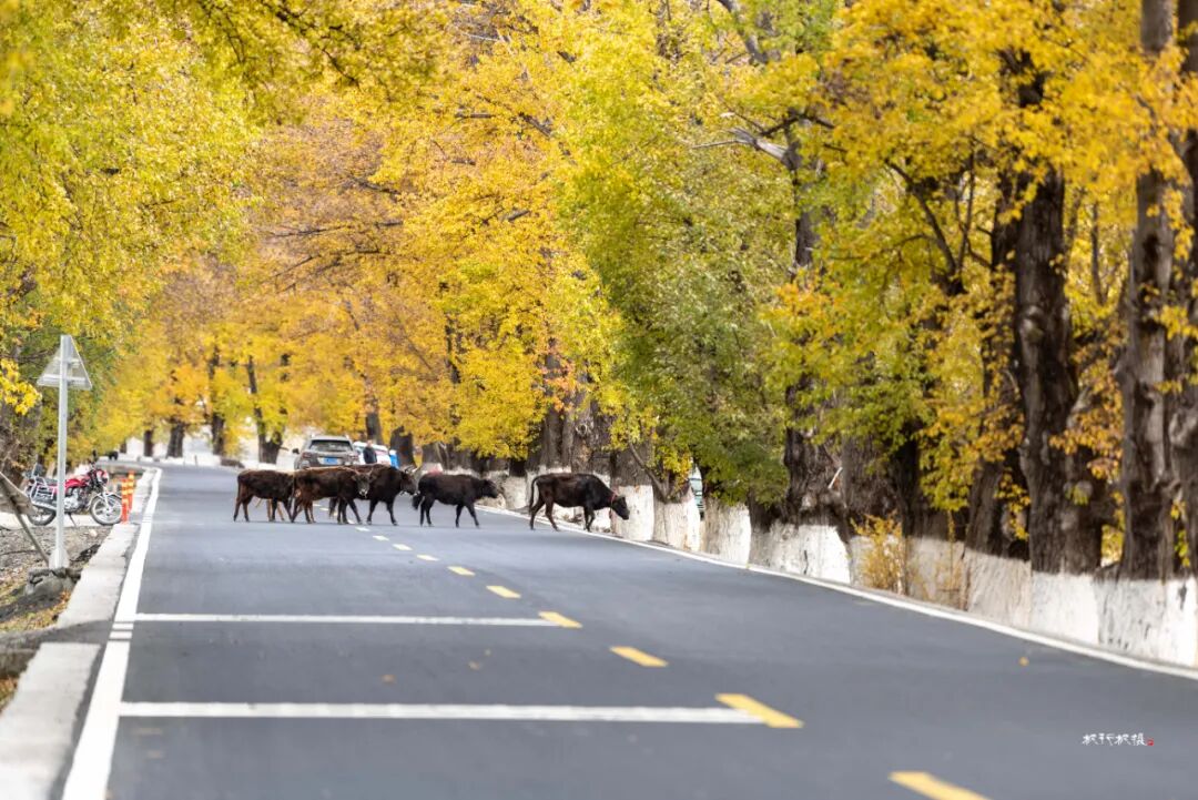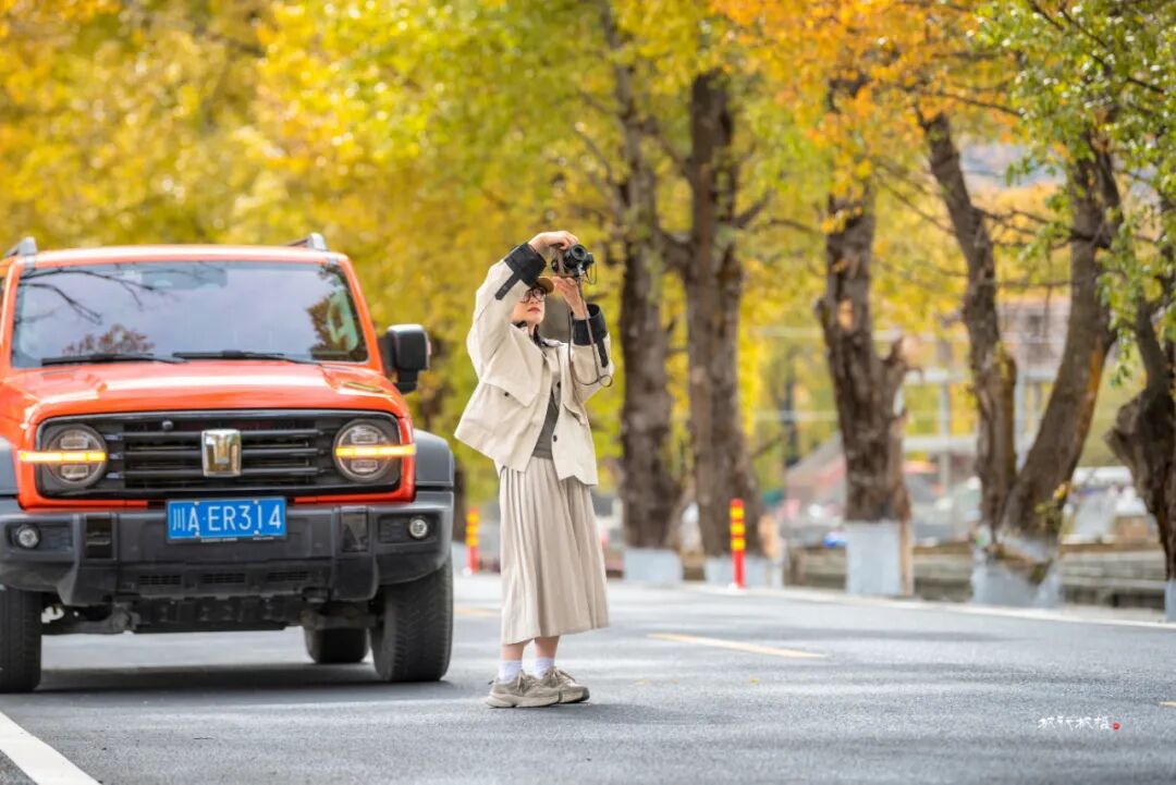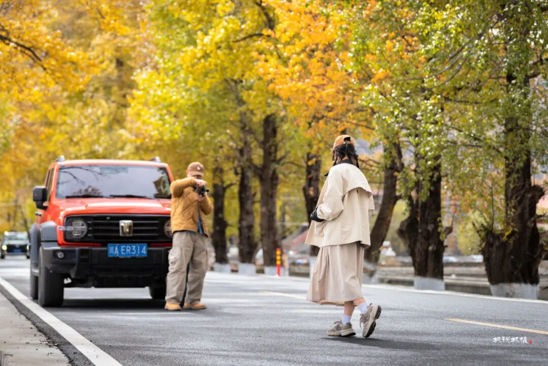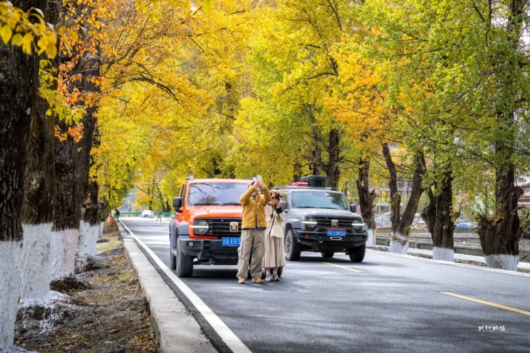 阳光透过叶片洒在路面上,车行其中,仿佛进入了一幅迷人的光影画卷。新都桥的秋天美得让人窒息,被誉为“摄影家的天堂”。在新都桥你可以尽情拍摄,邂逅川西最美秋天。
