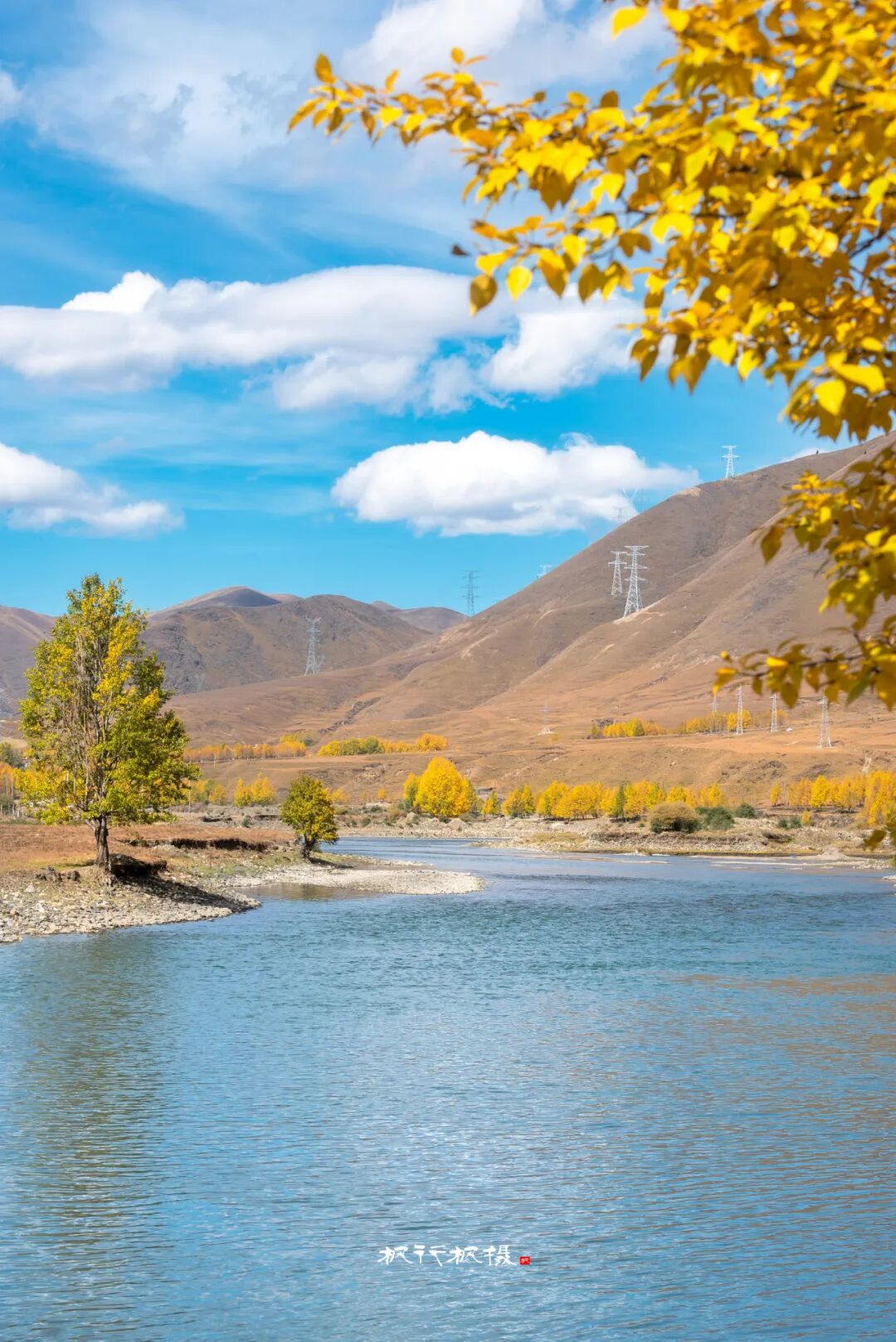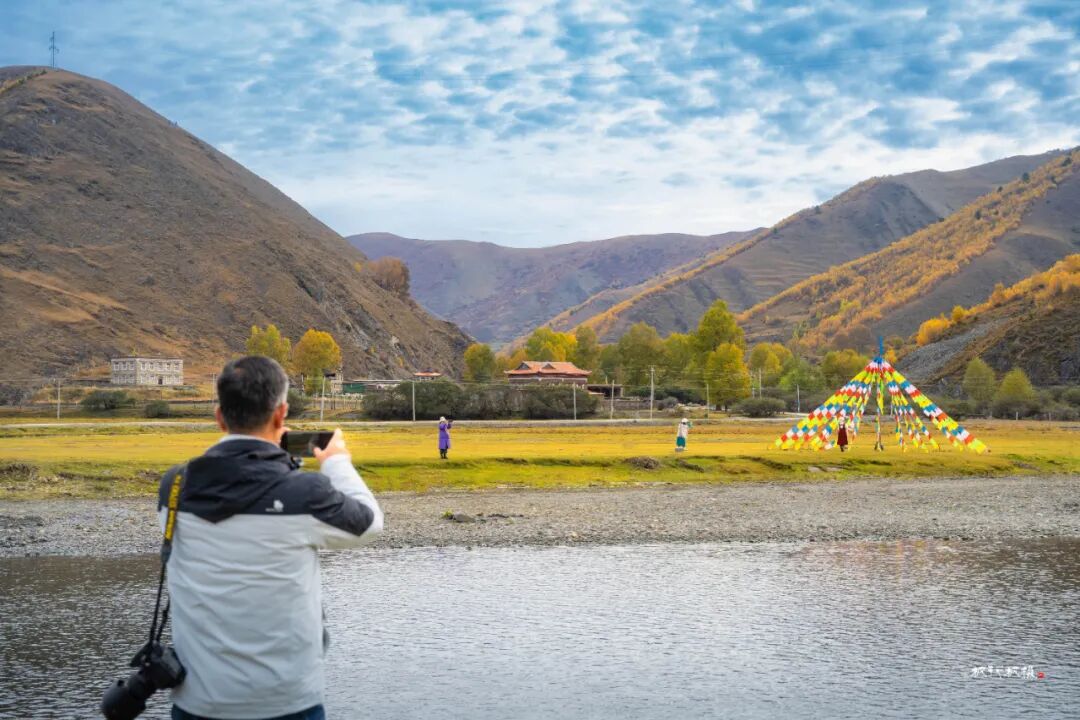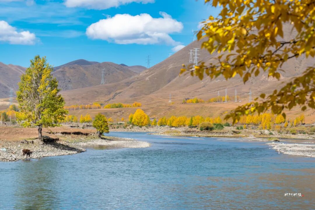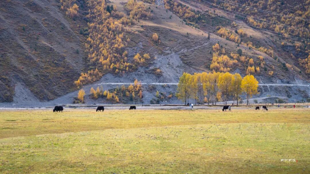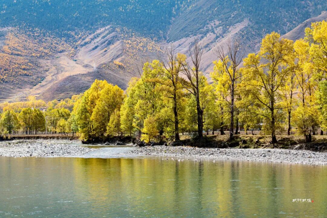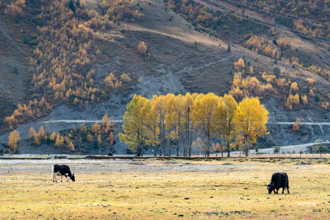 十月,出康定城翻越海拔四千多米的折多山,再下降到海拔约三千四百米的新都桥镇,你便走进川西最迷人的秋天。新都桥处于川藏线318国道和248国道的交汇处,是进藏路上值得停留的驿站。国道新都桥沿线十余公里的景观大道两侧,映入眼帘的的是雪山、草场、藏寨、牛羊和白塔。一条浅浅的河蜿蜒于山谷间,公路依河而建,湛蓝的天空下,公路沿线高大粗壮的杨树在秋的艳阳中金黄透亮。阳光透过叶片洒在路面上,车行其中,仿佛进入了一幅迷人的光影画卷。新都桥的秋天美得让人窒息,被誉为“摄影家的天堂”。在新都桥你可以尽情拍摄,邂逅川西最美秋天。