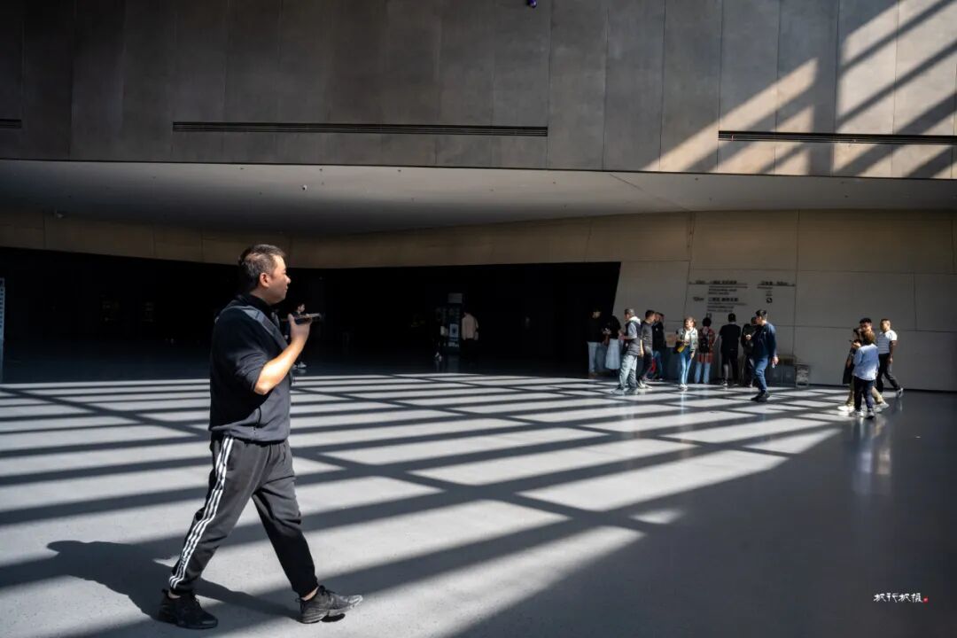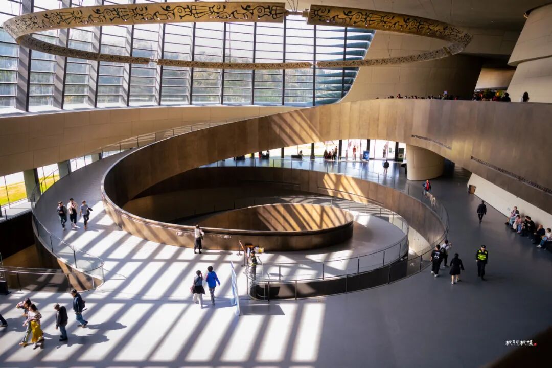 中庭处半径巨大的室内单支座螺旋坡道上,圜形铜质镂空吊灯扶摇直上,作为展陈辅助内容,为诠释恢弘古蜀文明增加延展宽度。