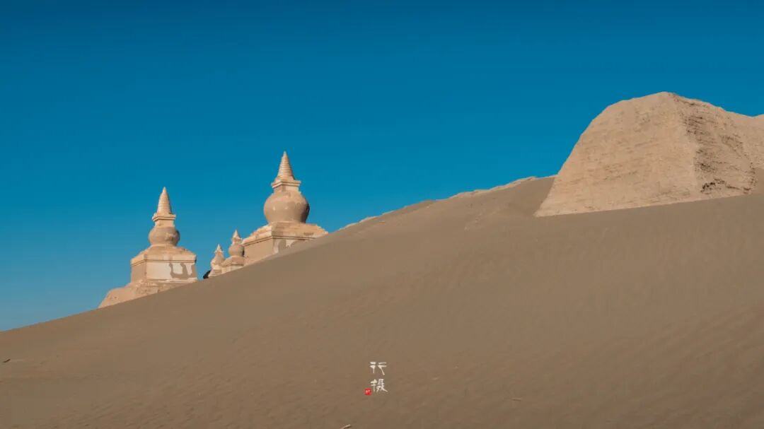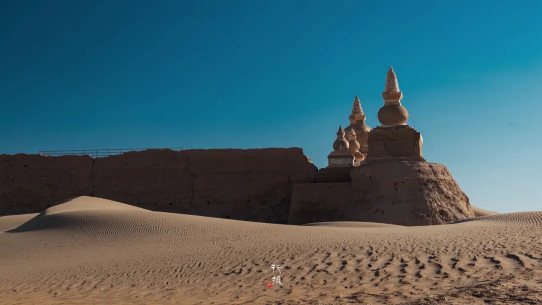 如今在古城遗址城内,荒凉满目,流沙下遍布的是官邸、寺庙和民居的颓垣断壁,到处都散落着瓷器的碎片。城的西北角的城墙上,至今还耸立着5座宝瓶似的佛塔,佛塔设计独具匠心,塔身大小不一,高低错落布置,最高的一座达13米。佛塔是用土坯垒成,古朴,圆融,安详,虽经数百年的风沙侵袭,今天依然耸立,像是守城的卫士肃然而立,成为黑水城独具魅力的标志。
