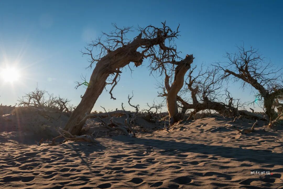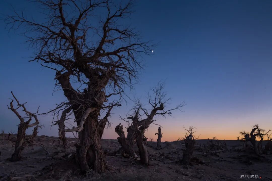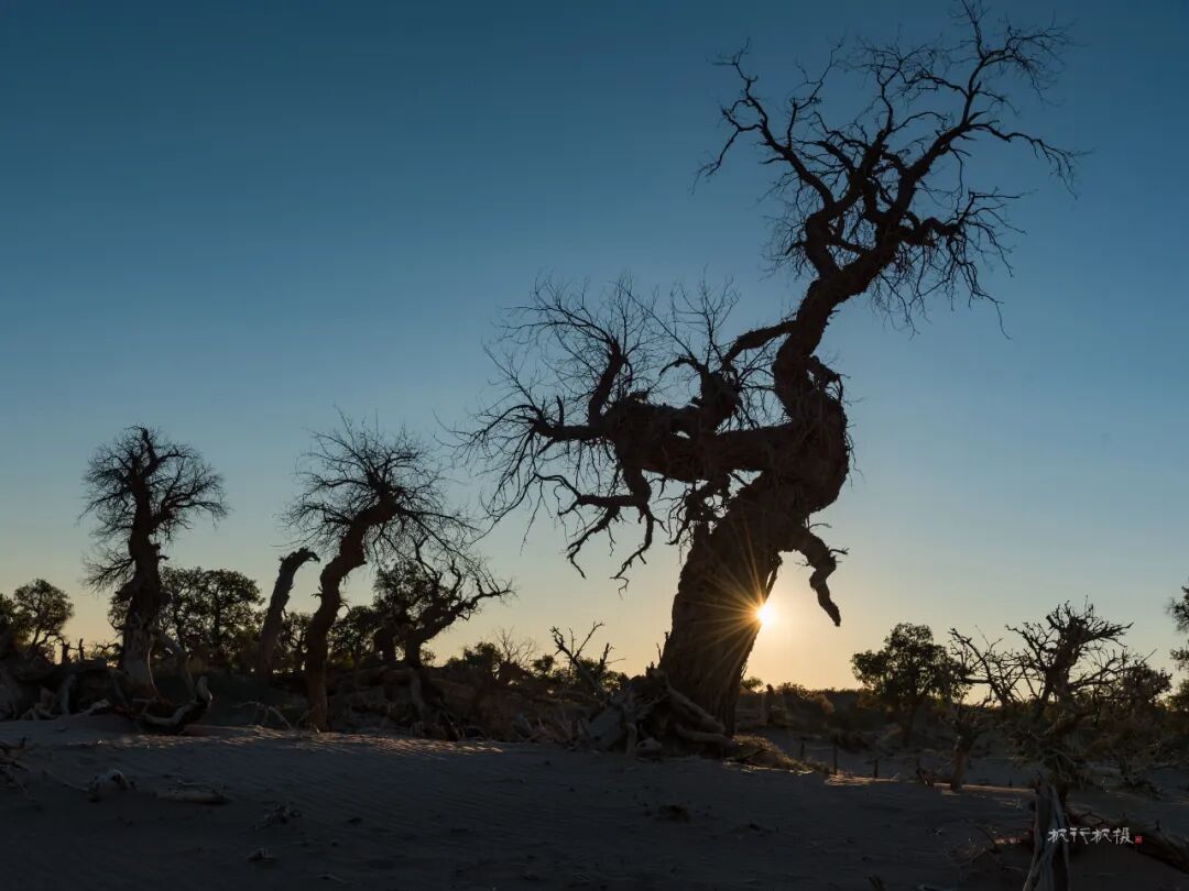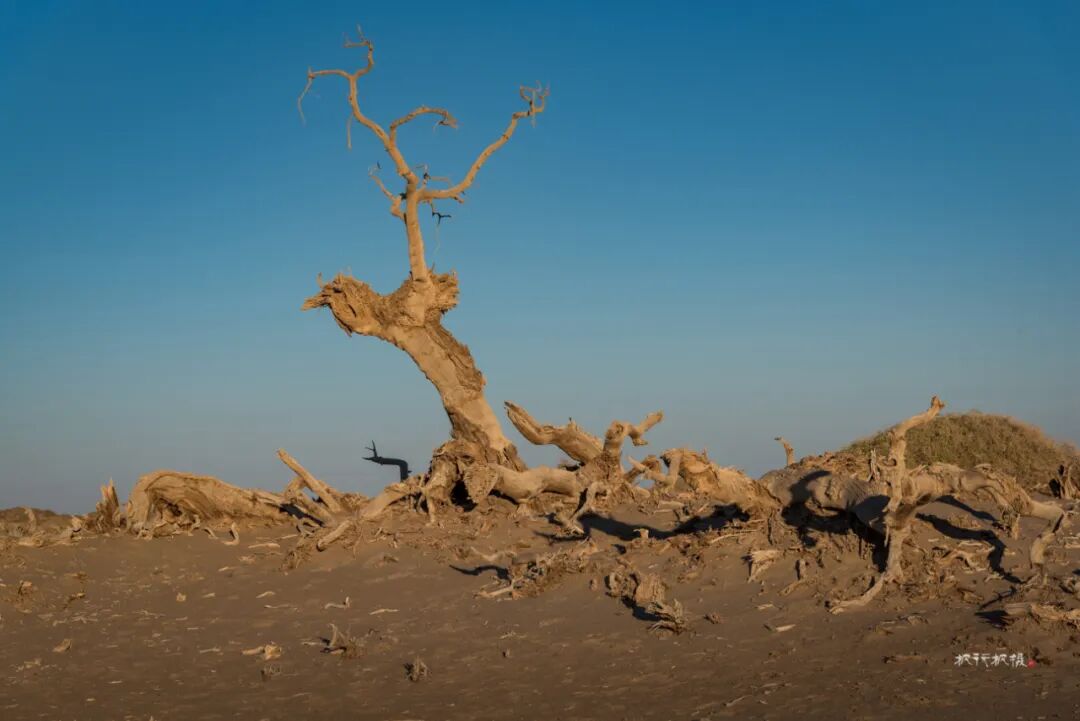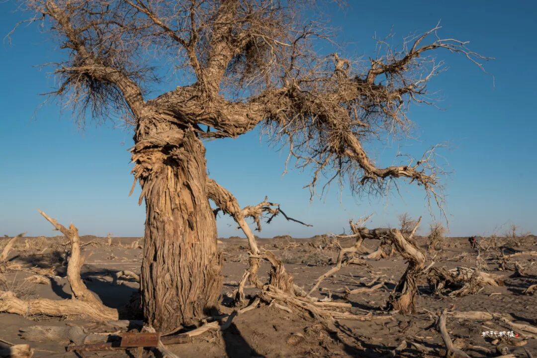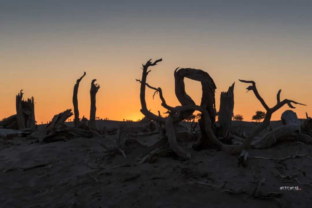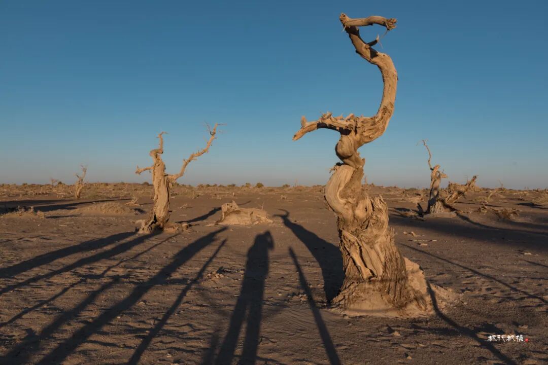 胡杨特有的耐腐特性,“死后千年不倒、倒后千年不朽”使大片枯死的胡杨树干依然直立在戈壁荒漠之上,枯死的胡杨或挺胸、或匍匐、或仰天长啸、或悲天悯人、屹立在沙原不肯倒下,犹如一群战死的武士,悲壮而苍凉, 形成形态怪异的景观。