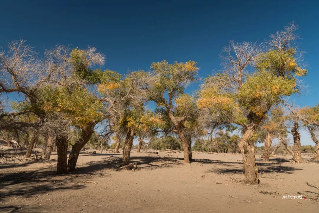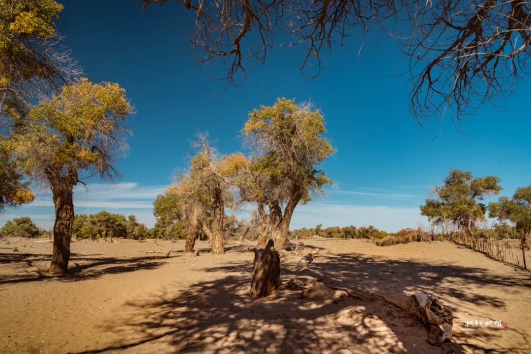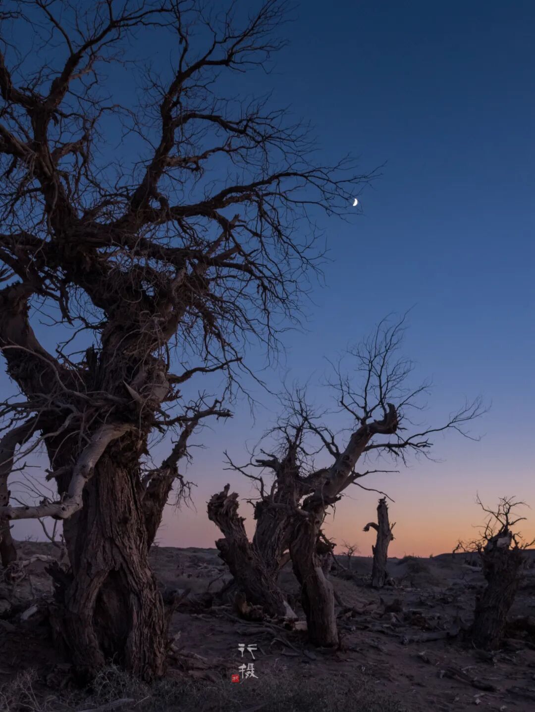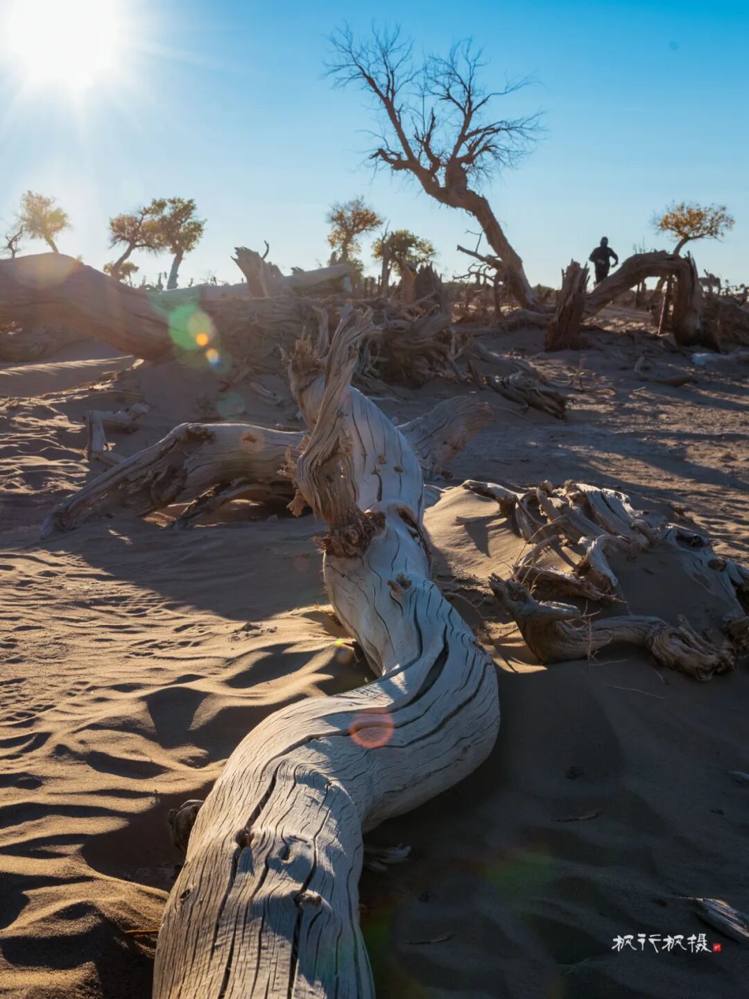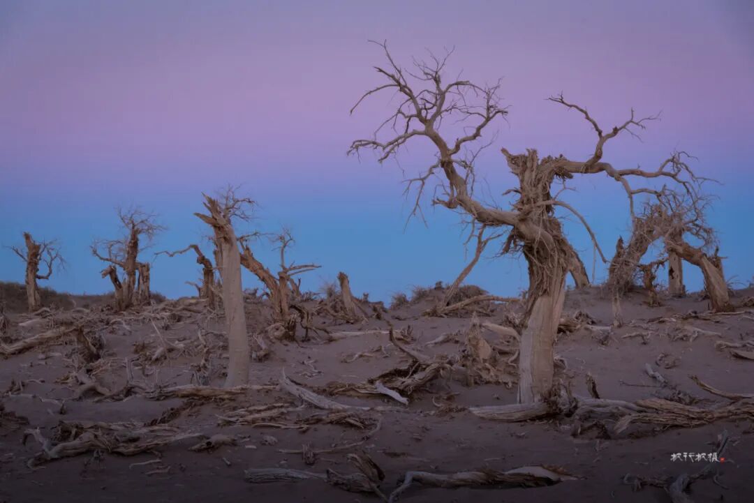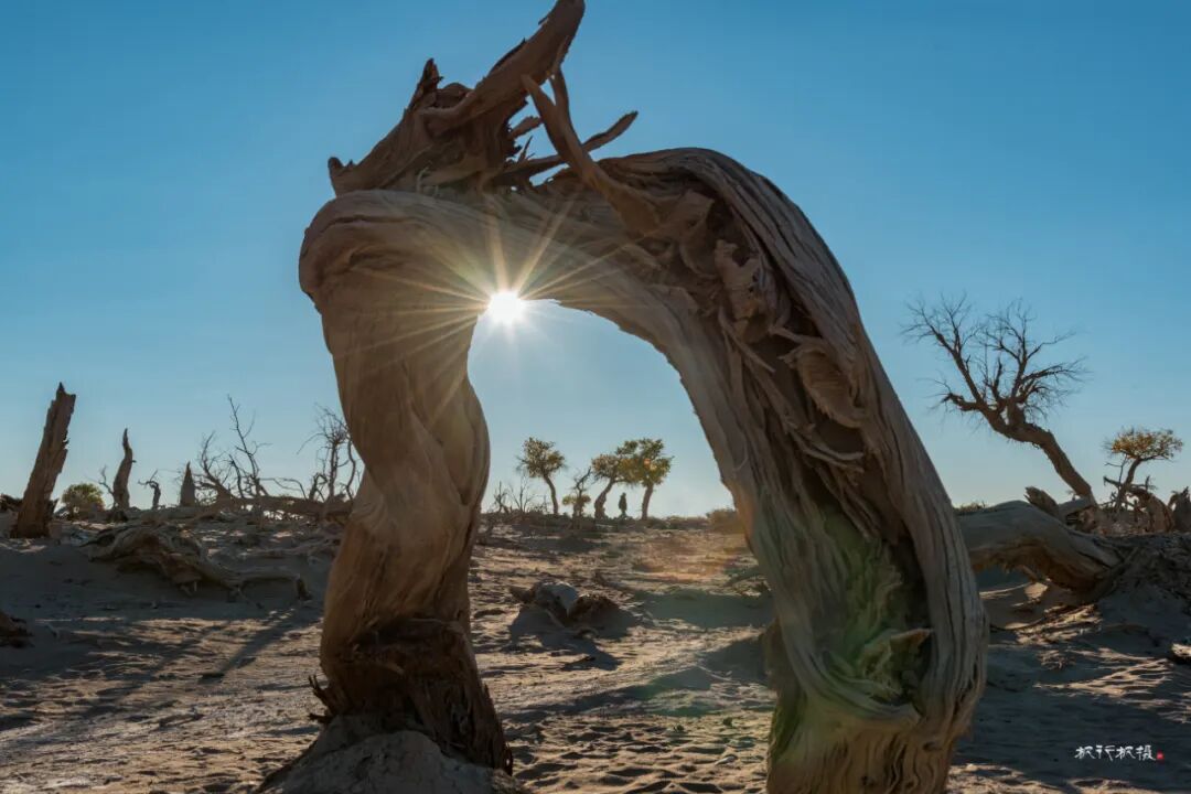 胡杨特有的耐腐特性,“死后千年不倒、倒后千年不朽”使大片枯死的胡杨树干依然直立在戈壁荒漠之上,枯死的胡杨或挺胸、或匍匐、或仰天长啸、或悲天悯人、屹立在沙原不肯倒下,犹如一群战死的武士,悲壮而苍凉, 形成形态怪异的景观。