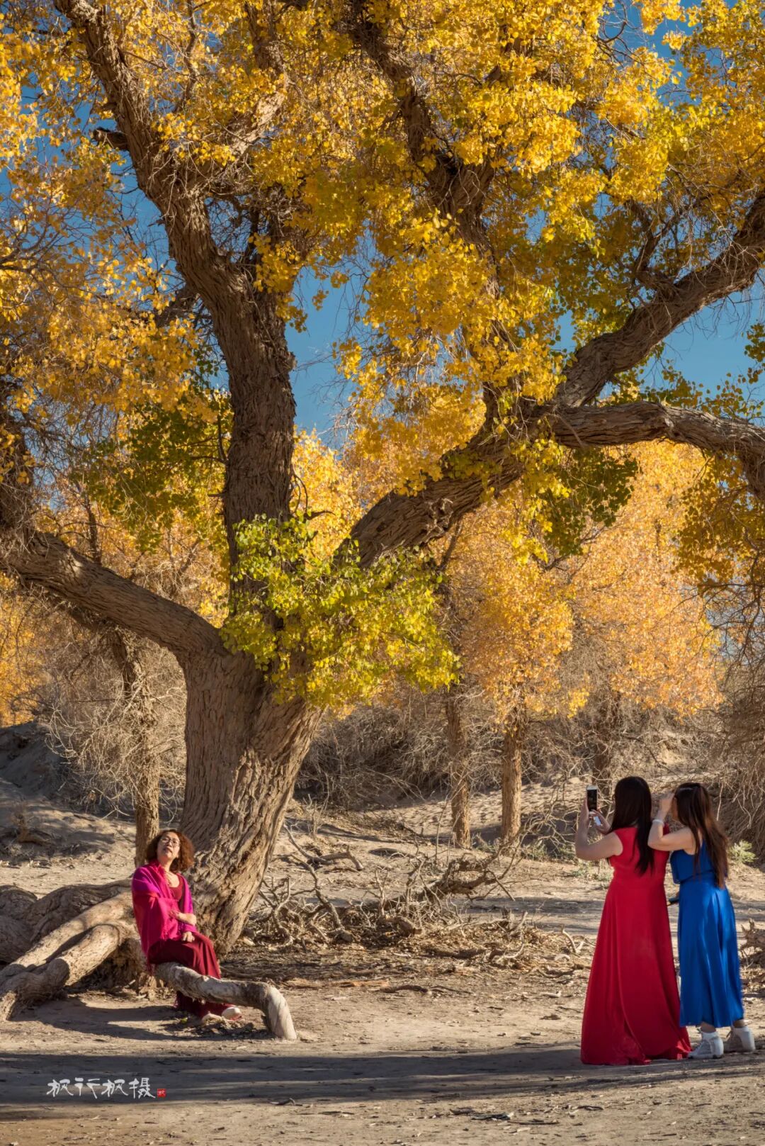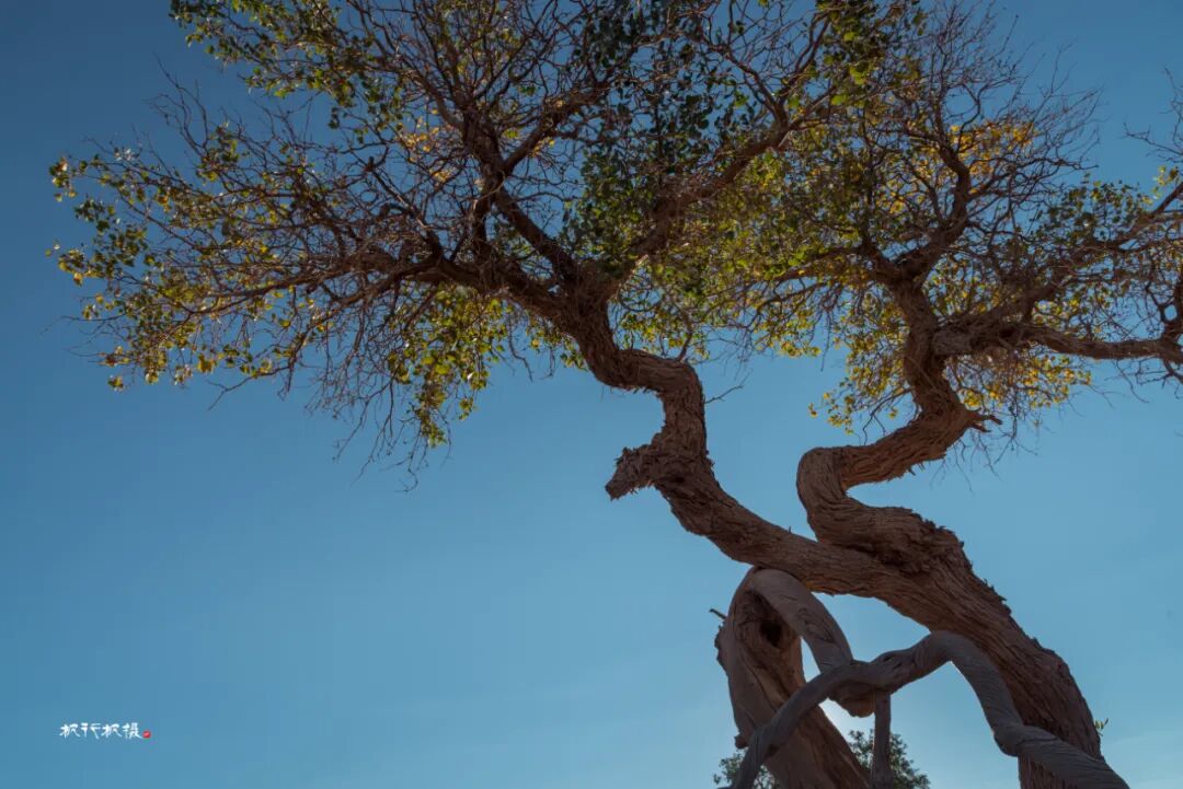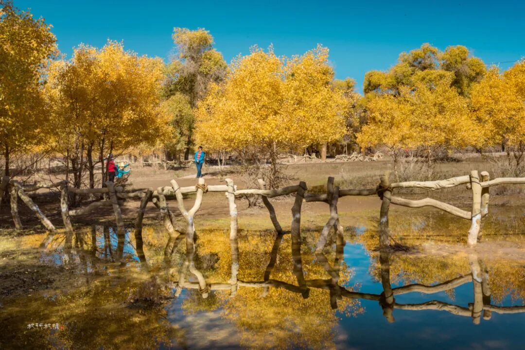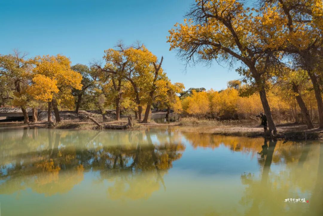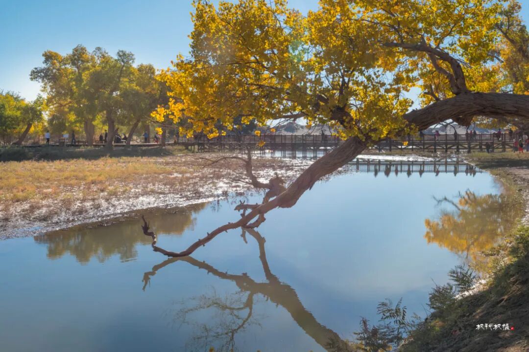 走进胡杨林深处,一条小河弯弯曲曲在林间流淌,正是它滋润着这千年的胡林,胡杨林也因这水而变得充满生机和灵动。水平如镜,蓝天与黄叶倒映在水面,异常的宁静而美丽。轻风佛来,水面微澜,揉碎了一池的色彩,风景变得愈加如梦似幻。二道桥面积很大,有河水流经,树龄也很长,最适合拍水中胡杨林的倒影;四道桥称为英雄林,树比较粗壮,是张艺谋《英雄》电影的拍摄地,电影中章子怡和张曼玉打斗的地方。静静地坐在这碧水边,好想让时光不再流淌,久久凝望,心已是沉醉不知归路了。