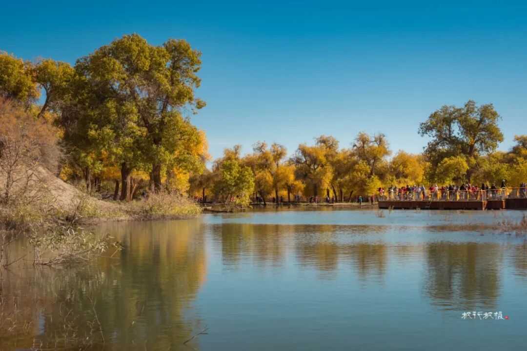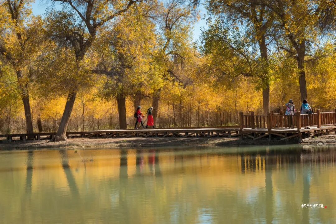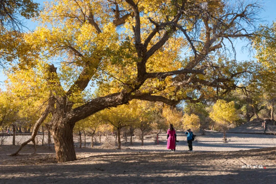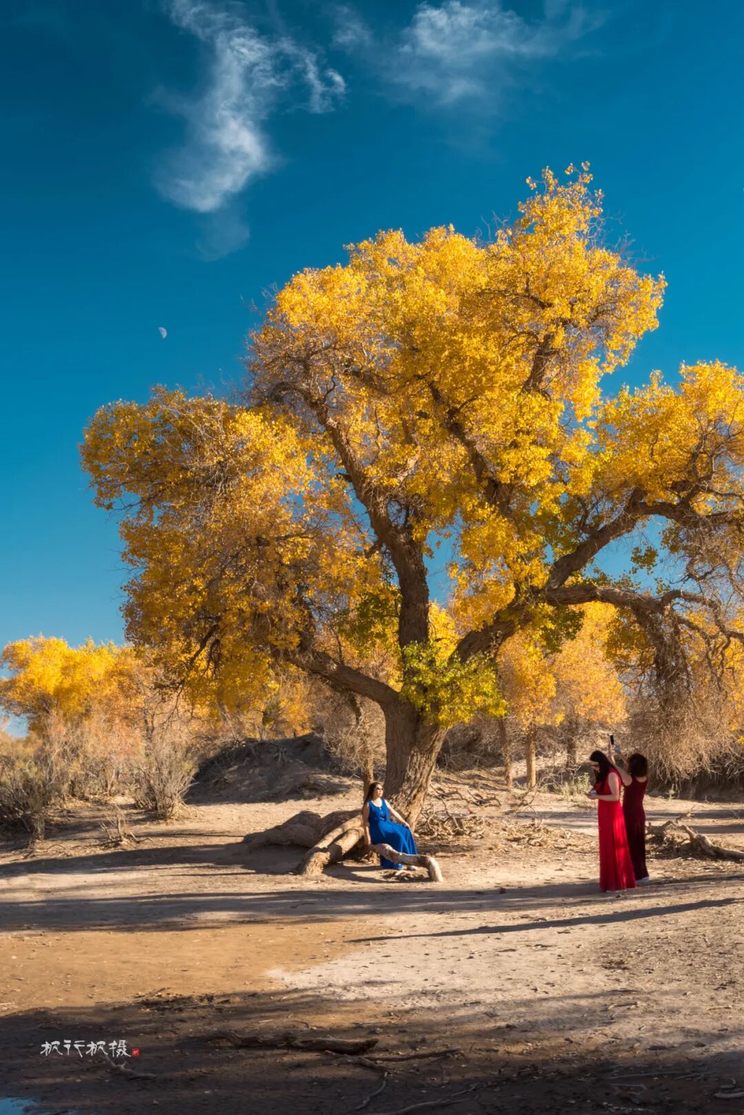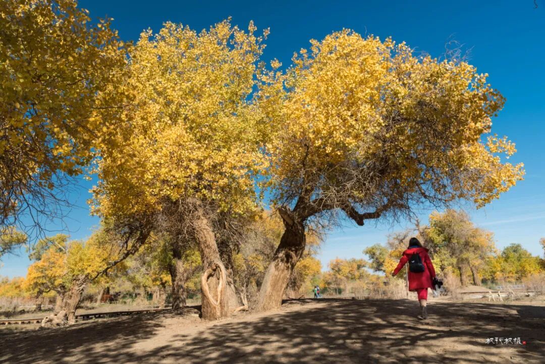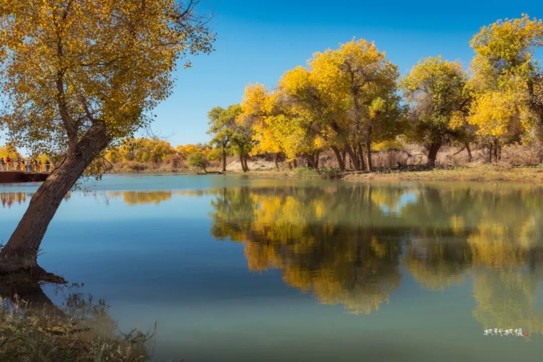 走进胡杨林深处,一条小河弯弯曲曲在林间流淌,正是它滋润着这千年的胡林,胡杨林也因这水而变得充满生机和灵动。水平如镜,蓝天与黄叶倒映在水面,异常的宁静而美丽。轻风佛来,水面微澜,揉碎了一池的色彩,风景变得愈加如梦似幻。二道桥面积很大,有河水流经,树龄也很长,最适合拍水中胡杨林的倒影;四道桥称为英雄林,树比较粗壮,是张艺谋《英雄》电影的拍摄地,电影中章子怡和张曼玉打斗的地方。静静地坐在这碧水边,好想让时光不再流淌,久久凝望,心已是沉醉不知归路了。