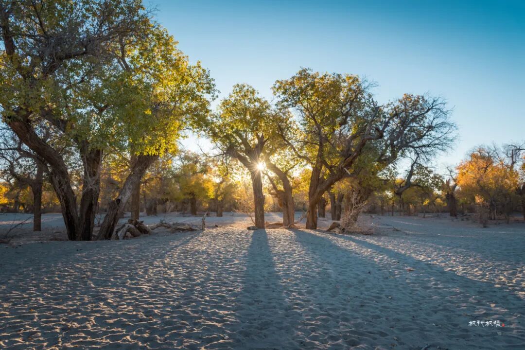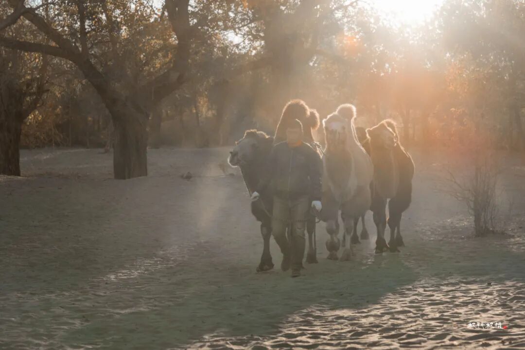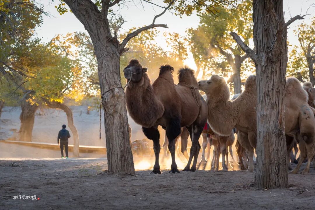清晨,刚进入二道桥便被眼前的美景吸引,起伏的沙丘上全是粗大的胡杨树,深秋的树林,金黄树叶在朝阳的照映下色彩更加动人。漫步在茂密的胡杨林中,仿佛进入神话般的仙境。高大茂密的胡杨千姿百态,或似挺拔独立来自远古的武士、或似苍龙腾越仿佛饱经苍桑的老者,或似曼妙的少女婀娜多姿。伫立在黄昏的沙海中,风光无限,美不胜收。忍不住拿着相机追赶着驼队,追赶着变幻的光束,完全不能能停下来,让人痴迷!