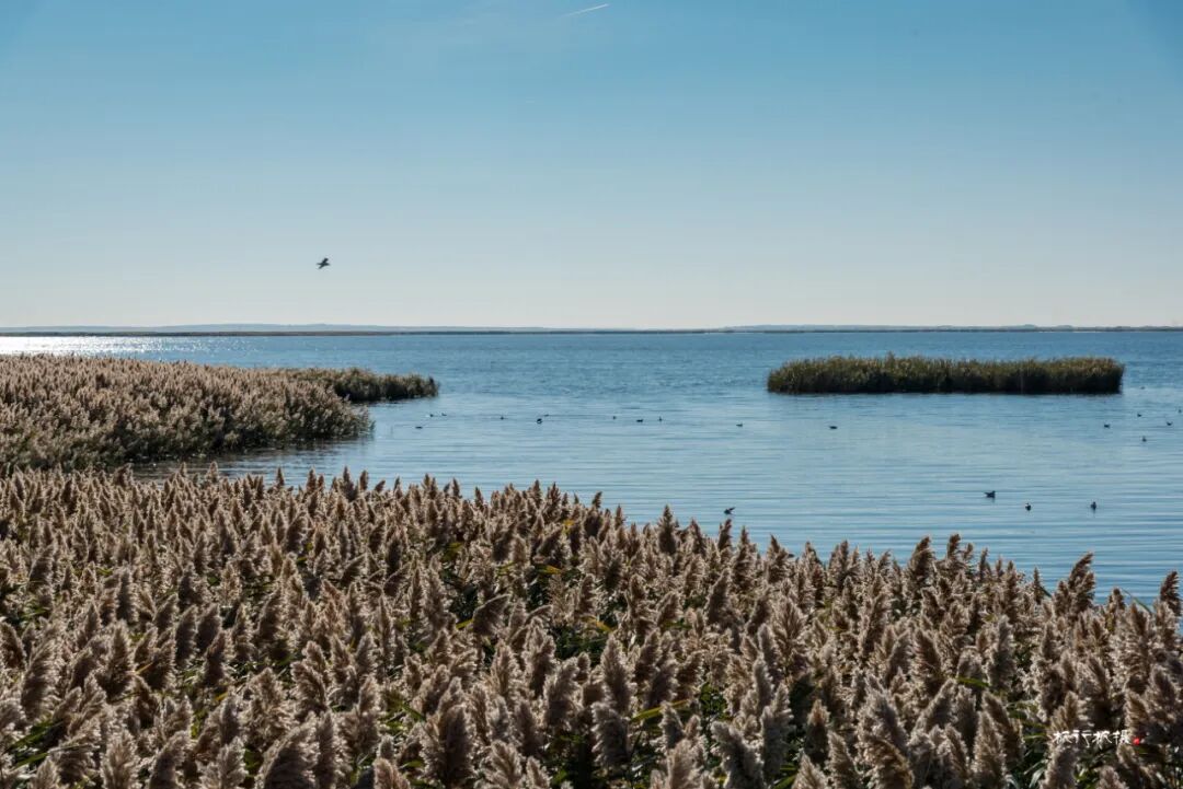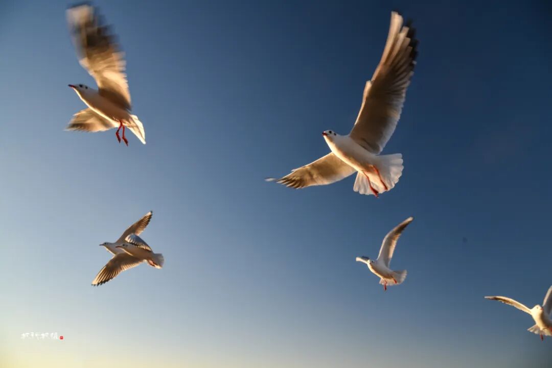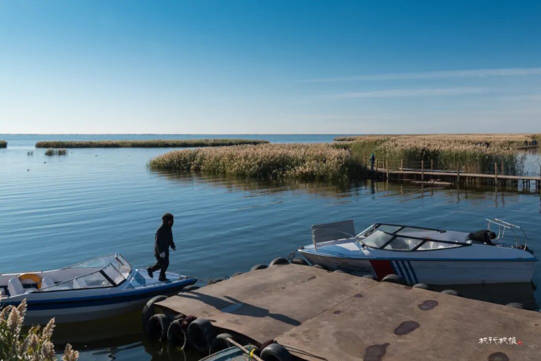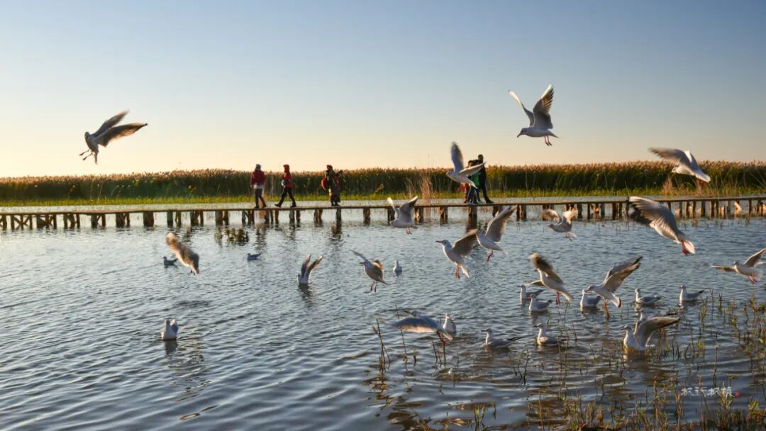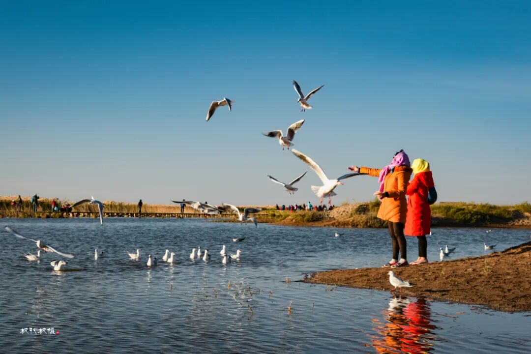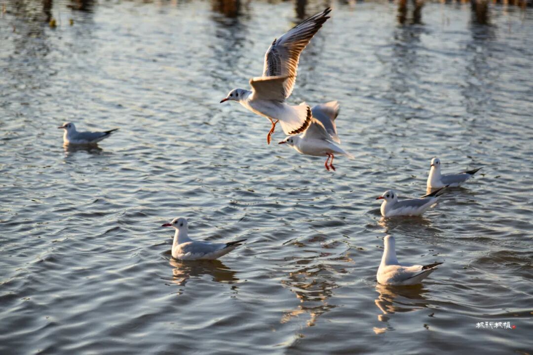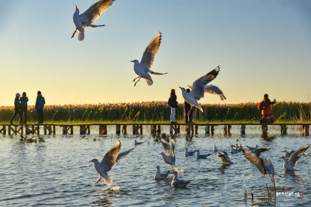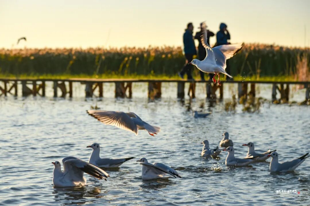 清晨,朝阳将湖面将染成金色,摇曳的芦苇也是一片金黄。天高云淡,红嘴鸥在近处水面悠闲的游动,游客扬一把鸟食,成群的红嘴鸥便追随而来,鸟鸣人欢。快艇在波光粼粼的水面上,划出一条翻滚的碧浪,红嘴鸥在伴着快艇飞翔,居延海竟然是这般五彩斑斓、生机盎然。