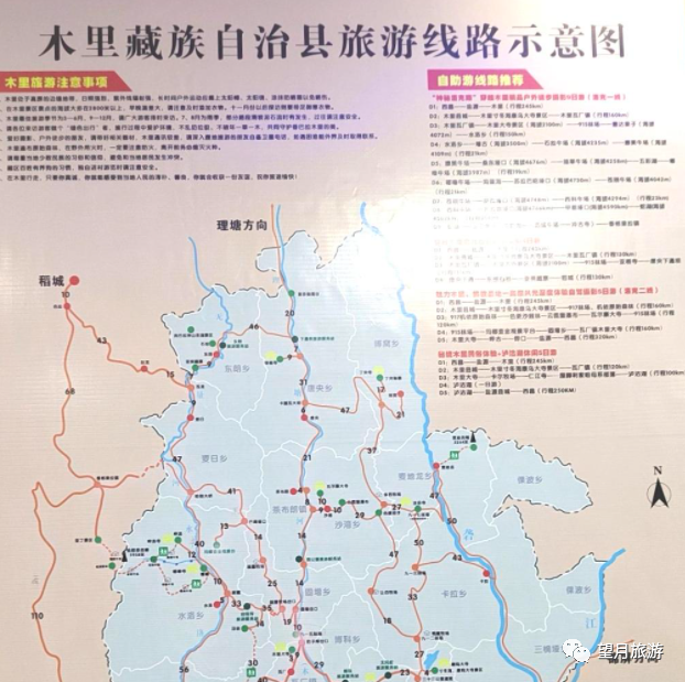 推荐旅游路线为攀枝花—盐源—木里县城—寸冬海子—玛娜茶金观景台—牧民新村—机依—瓦尔寨大寺—唐央雄鹰谷—木里大寺—东拉、嘟噜—白水河—满措—呷洛牛场—水洛—木里县城。在这里的交通方式为自驾最合适,尽量驾驶底盘较高的车型,这里虽然道路起伏但是总体来说路况还是不错的,建议出发前加满油箱再出发。