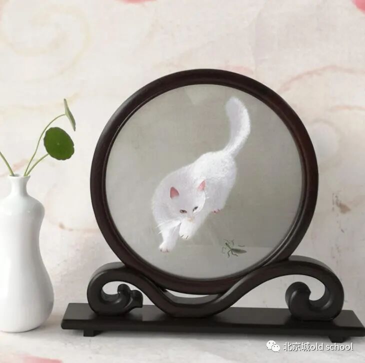 帮着苏州建立了苏绣研究所,它那儿绣的最好的就是白猫螳螂,50年代的时候,几只白猫螳螂的双面绣被送到了北京,在工美服务部引起了轰动,原因并不复杂,要知道,这苏绣小猫的毛是将一根丝线劈为48根细丝之后绣成的,而猫的眼睛由十几种颜色的丝线混合而成
